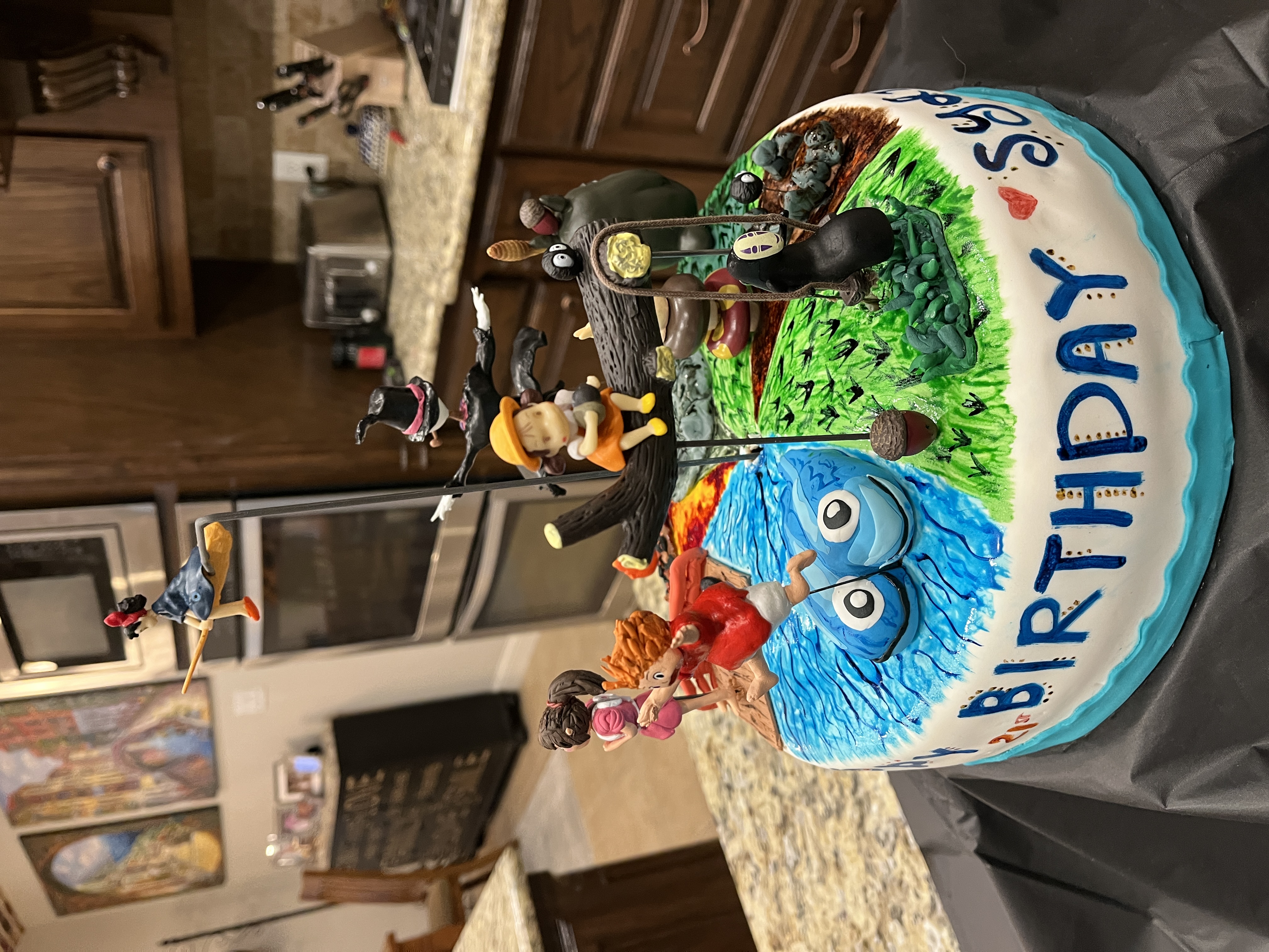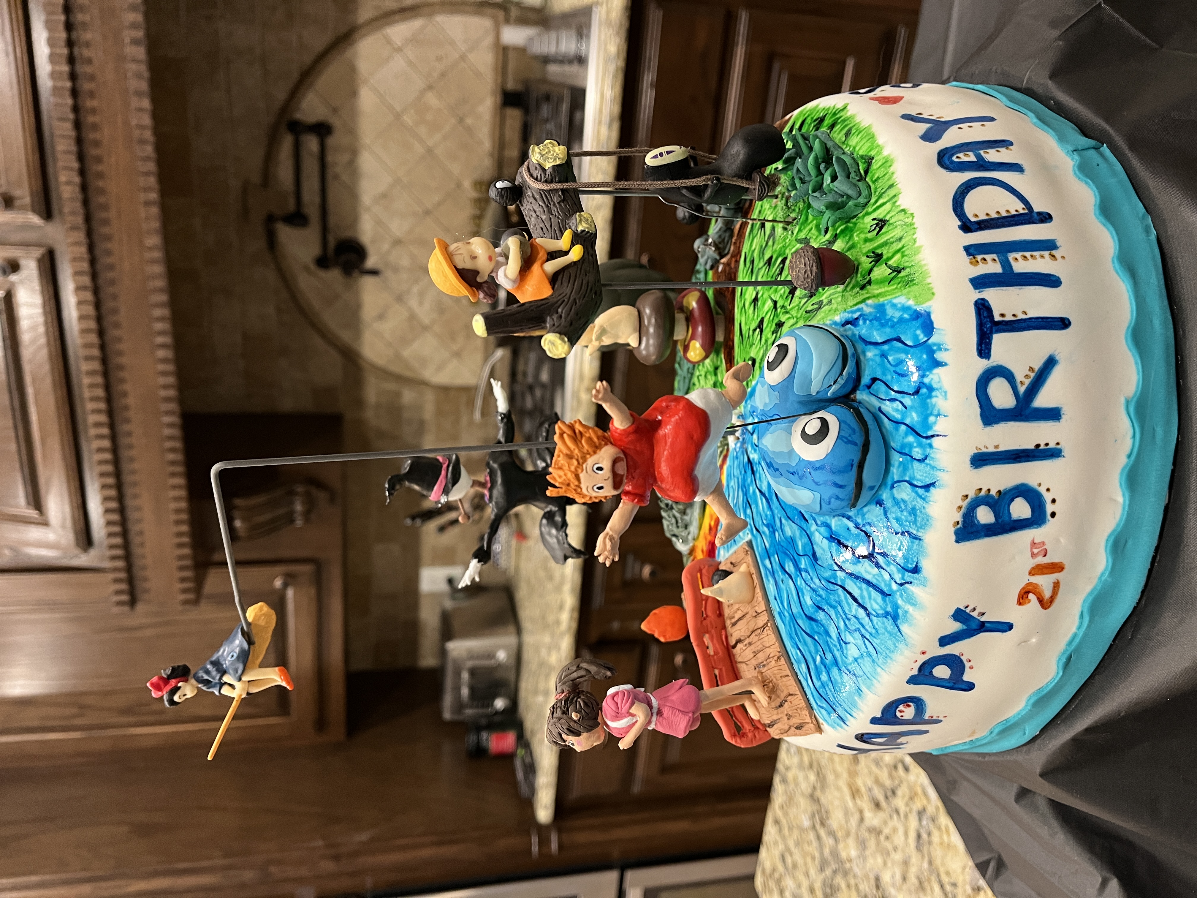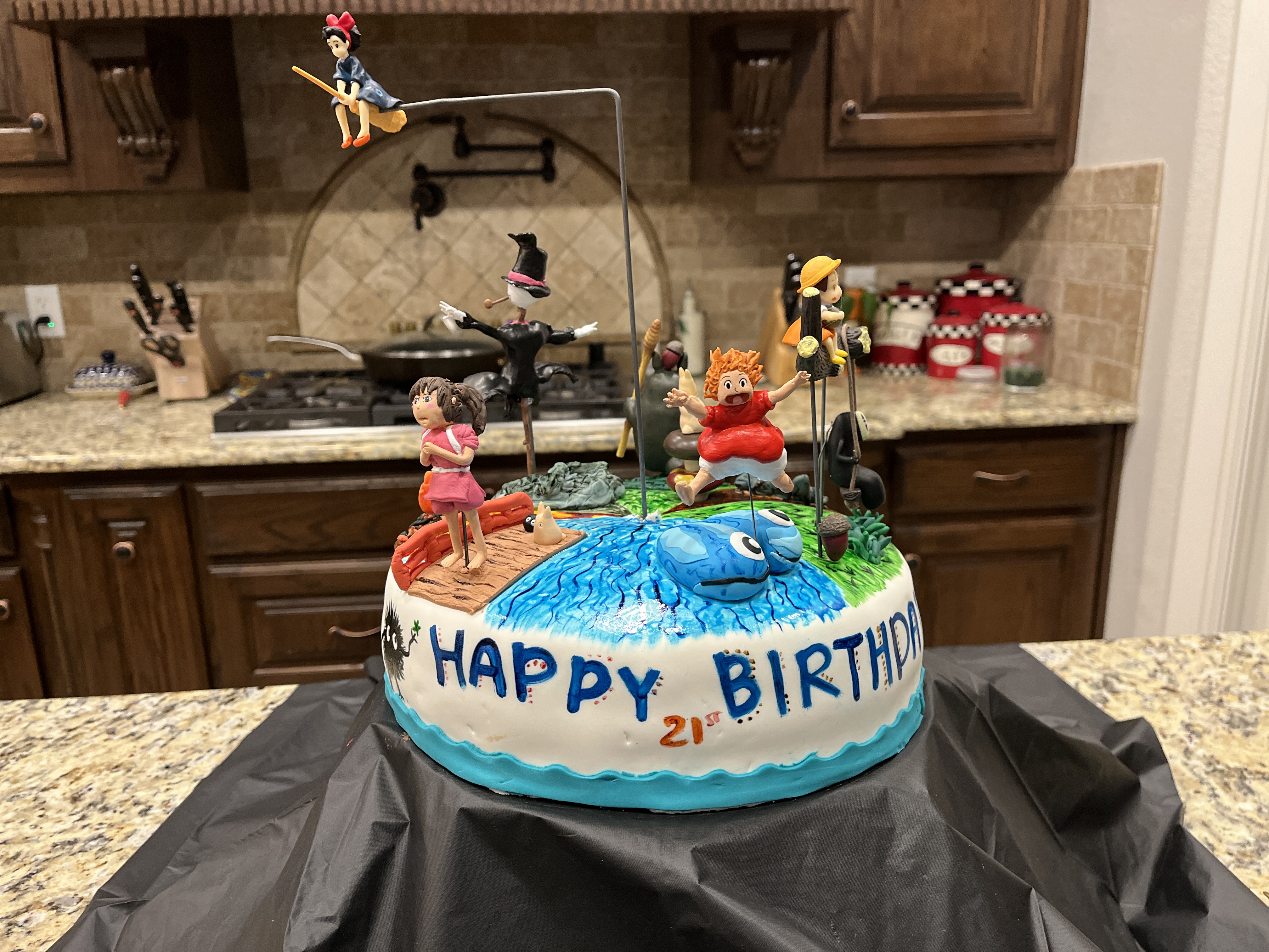 This was our first cake in a very long time (move overseas, COVID overseas, move home, house fire, rebuild, redoing previous years house projects). Sydney wanted a Ghibli cake for her 21st birthday. Small cake but we tried to fit her favorite movies in there. We squeezed in Chihiro, No Face and the Soot Sprites from Spirited Away, Mei and Totoro from My Neighbor Totoro, Howl and Calcifer from Howl's Moving Castle, Kiki from Kiki's Delivery Service and Ponyo from Ponyo. It is all very simple compared to previous cakes but it was very cute. We all love the Ghibli movies so it was special to make a cake to represent them. Some figures were purchases and some made. It was chocolote cake covered in chocolate frosting overlayed with fondant. We all worked on this cake, even the birthday girl. It was a fun cake to make.
