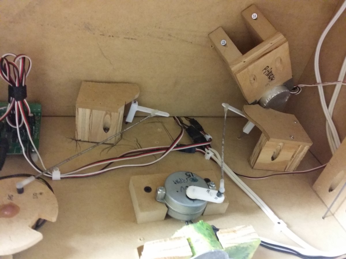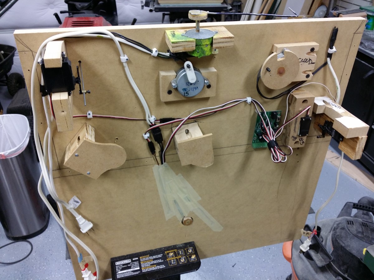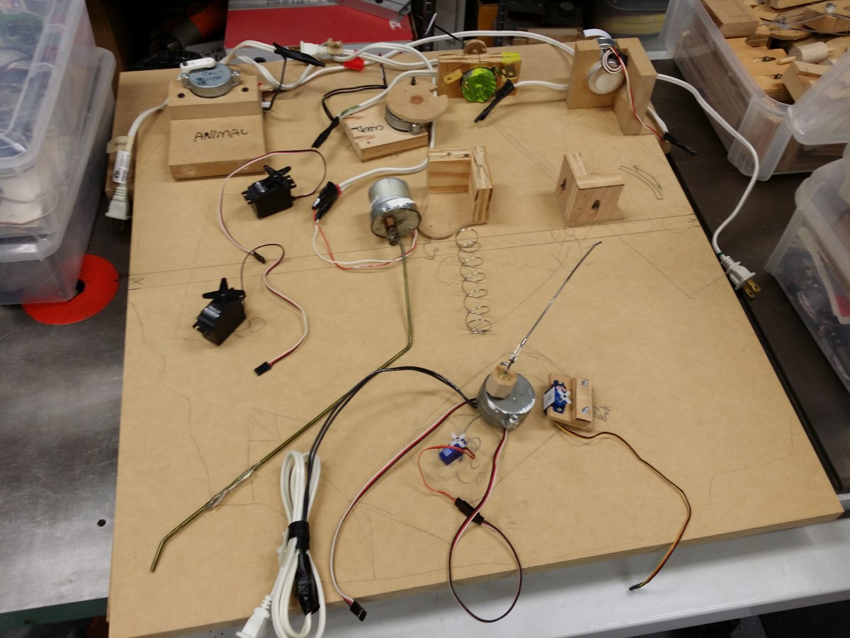 servos and 4 timing motors moving the characters. My daughter did the crayon