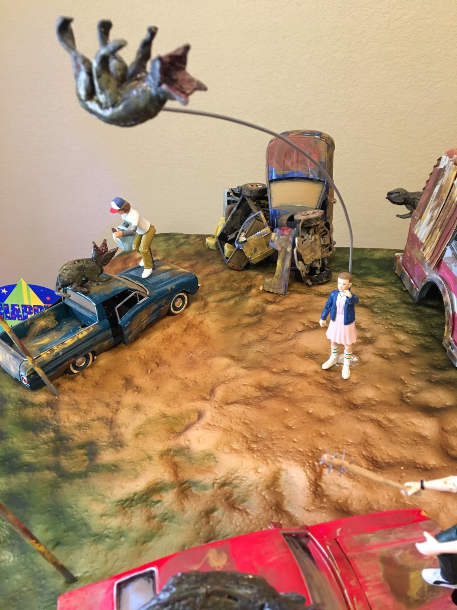 the junk yard and the upside down from the show. Will is being chased by the demogorgon and a tentacle from shadow monster. Eleven,
