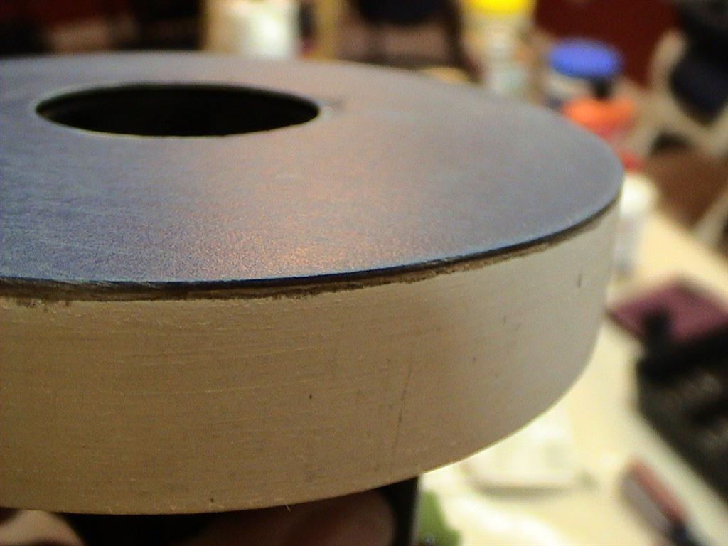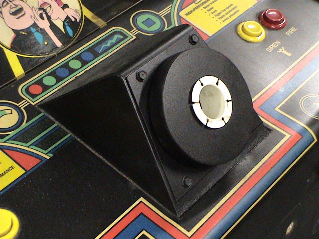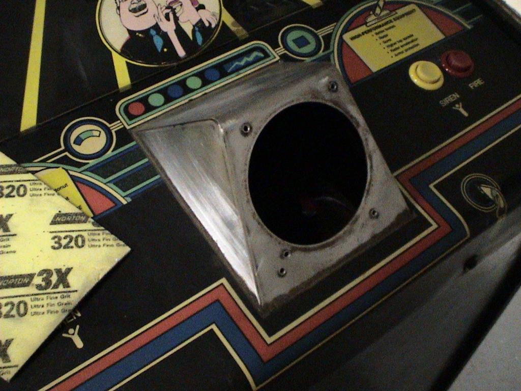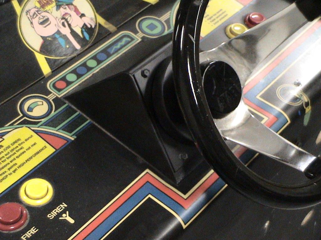 The last major part was the steering wheel. Not only was it rusted but the plastic/metal housing it sets in was broken. Broken yes, but the game still plays flawlessly, but it is a horrible looking control panel with sides of the housing broken off. The housing also came with a piece of white pvc pipe stuck on there but it looked pretty bad. Cleaning the wheel was easy using Fast Orange hand cleaner for the rust, Chrome polish for the shine and Armor All wipes for the handle. For the housing I decided I would use the pvc that the cabinet came with but add laminate for a clean look. Much cheaper than trying to find the same Atari housing in mint condition. I roughly cut some laminate in a circle and epoxied it and the pvc to the housing. Then I sanded and puttied the edges until it was nice and smooth. Next I stripped the metal control panel mount with sandpaper, since I was going to repaint anyway, I figured it should all look the same. Again I used Rustoleum textured black paint on the panel mount and housing. This is how it looks with the wheel attached.