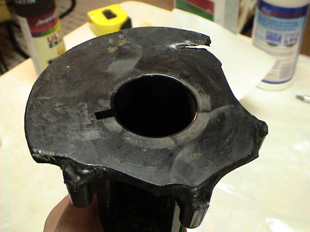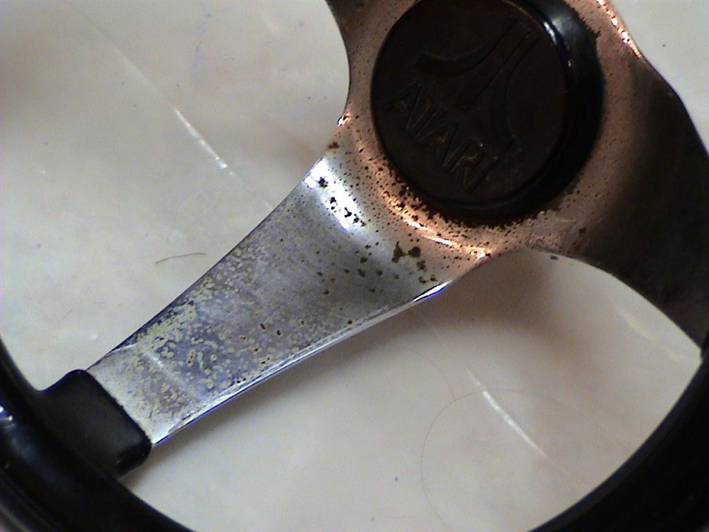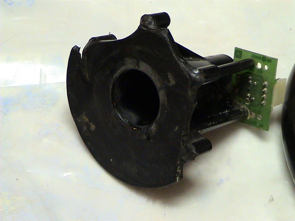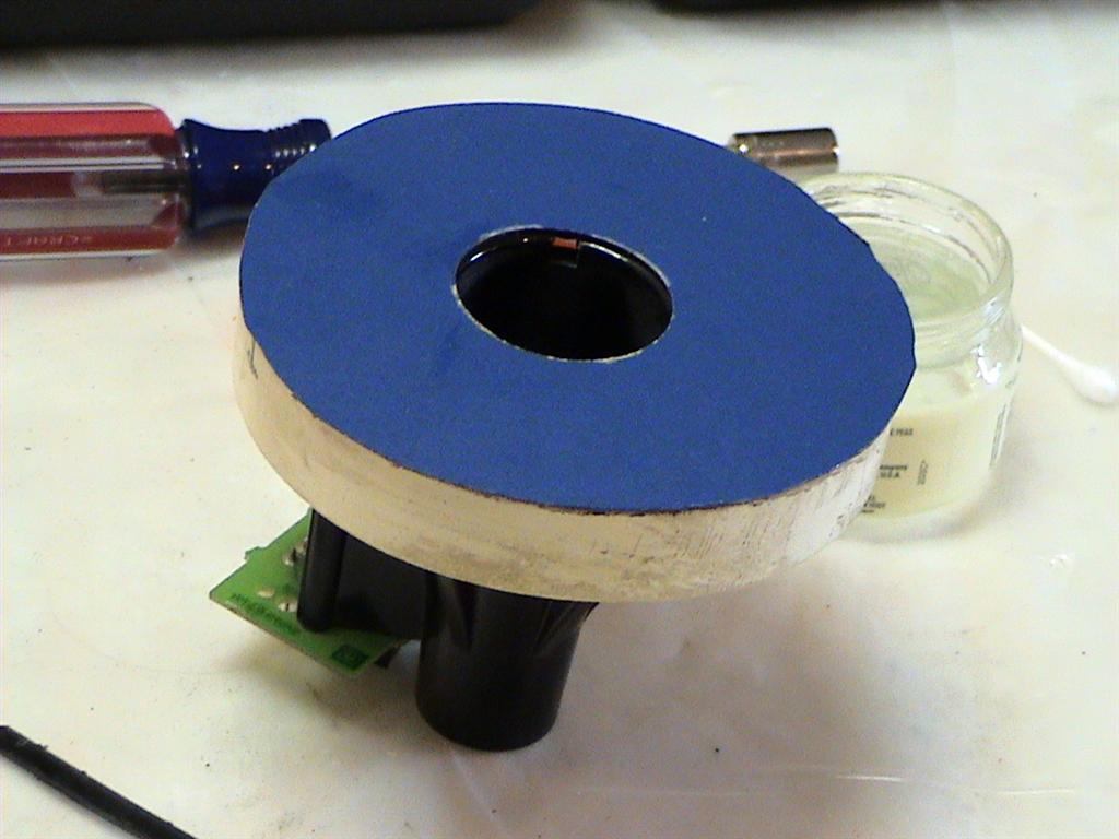 The last major part was the steering wheel. Not only was it rusted but the plastic/metal housing it sets in was broken. Broken yes, but the game still plays flawlessly, but it is a horrible looking control panel with sides of the housing broken off. The housing also came with a piece of white pvc pipe stuck on there but it looked pretty bad. Cleaning the wheel was easy using Fast Orange hand cleaner for the rust, Chrome polish for the shine and Armor All wipes for the handle. For the housing I decided I would use the pvc that the cabinet came with but add laminate for a clean look. Much cheaper than trying to find the same Atari housing in mint condition. I roughly cut some laminate in a circle and epoxied it and the pvc to the housing. Then I sanded and puttied the edges until it was nice and smooth. Next I stripped the metal control panel mount with sandpaper, since I was going to repaint anyway, I figured it should all look the same. Again I used Rustoleum textured black paint on the panel mount and housing. This is how it looks with the wheel attached.