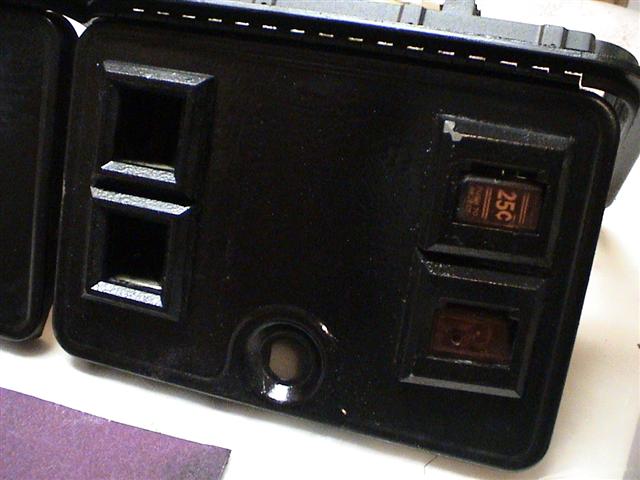 The next part was the coin door. Although it looks fairly clean I wanted it to look newer so I stripped the paint and will be replacing the coin reject buttons and adding two locks. I used paint stripper to pull the paint off and steel wool to finish off the underlying rust. Then I shot it with Rustoleum textured black paint on the front and black satin on the back. This is how it looks all put together again.
