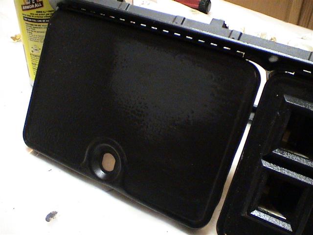 At first glance the only real problems were the scratches on the blue sides so originally I was just going to put new laminate on the sides but decided that 2 sheets at 50 bones a piece was too much so I went for the arduous task of stripping and repainting instead. After I started sanding away I noticed that the right side previously had laminated under the paint and the left side just particle board. The particle board side came off very easily but the laminate was harder going as it starts to melt under the orbital sander. Apparently there were quite a lot of scratches on the laminate side as I reached bondo that would not let go of the blue color. After a few nights of sanding I finally got both sides, front and back all smoothed off and puttied. I rolled on one coat of primer and got it all sanded down for the gloss black.