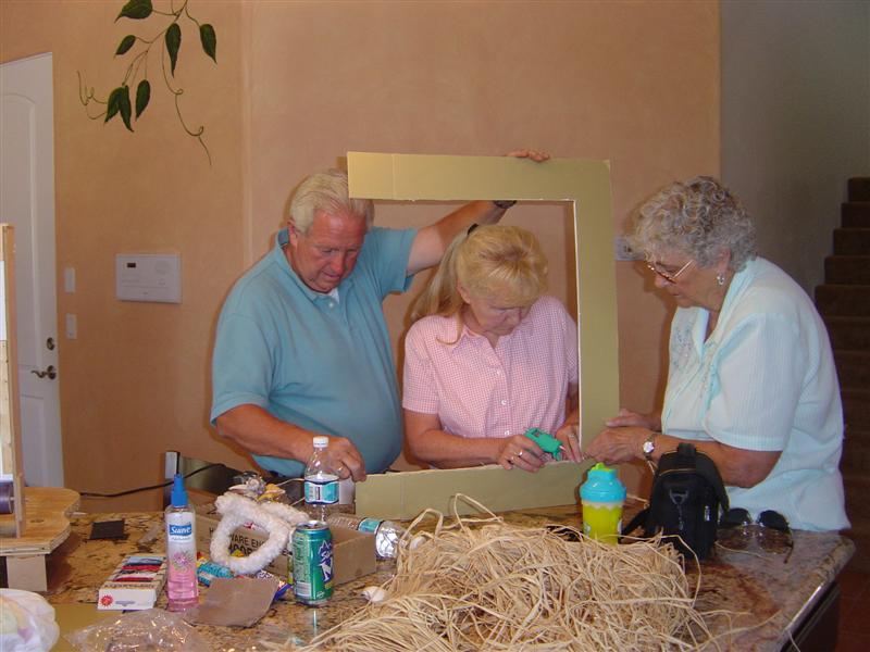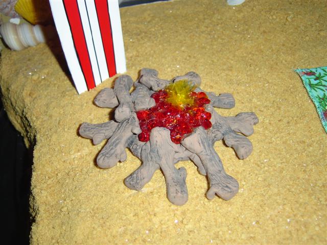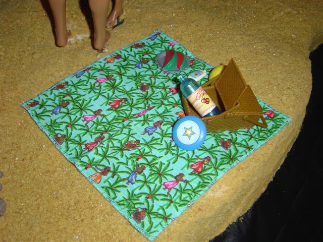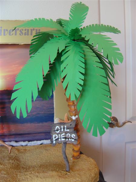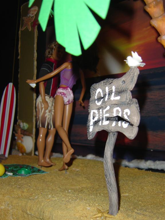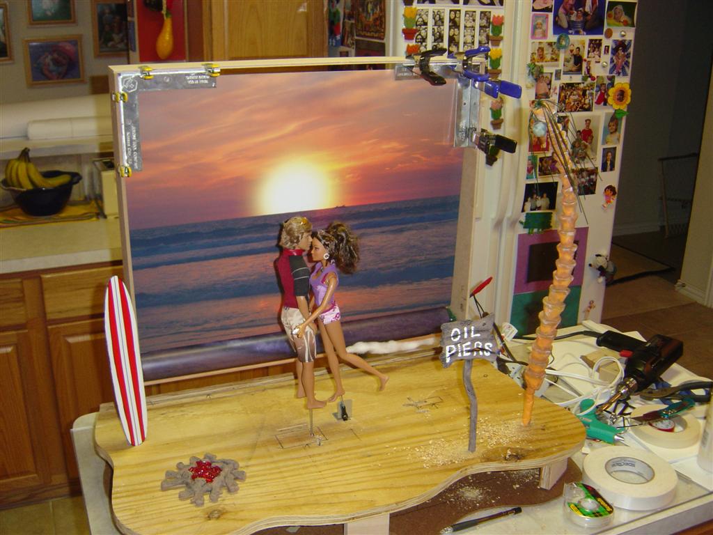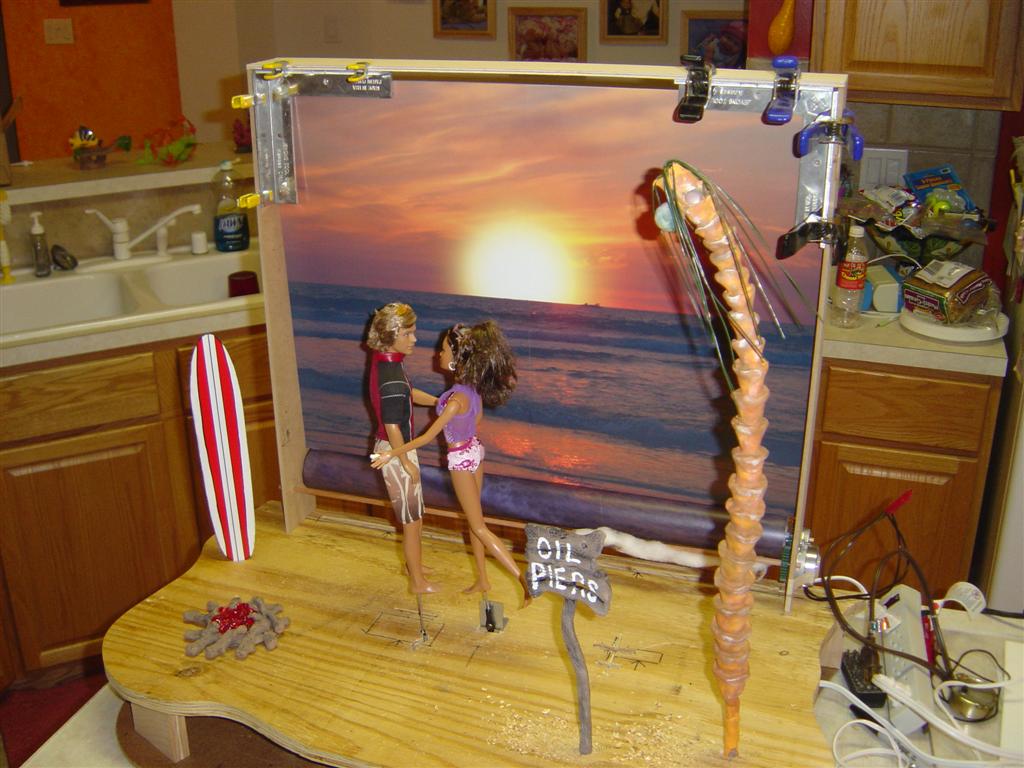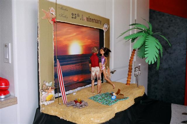 The next parts were just fun to make. We made a fire with crushed red glass as the embers. Under the fire we had a flashing LED to simulate flickering coals. Lili did all the sculpting out of Sculpy clay and I broke the glass. If you're on a beach you have to have a palm tree! I made the tree from Sculpy and embedded wires inside for the branches. Lili finished it off with paint then cut and glued the branches. We even put coconuts but no one saw those. Marty and Kathy dated on Oil Piers beach so we wanted a sign saying so. Lili did it all. This was my favorite piece of the cake. And you have to have seagulls. We had one flying around above the camp site. We couldn't find suitable seagulls and didn't have the time (or talent) to make nice ones so we settled for doves. I think they're doves anyway? One flying and one on the sign. Once the cake was done we placed some of the Barbie beach stuff to make a campsite. Here are a couple shots of the full mockup before shipping. Numero uno and numero dos.