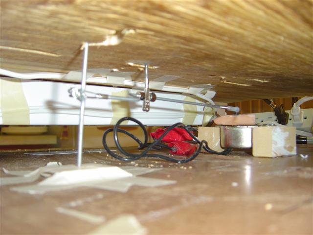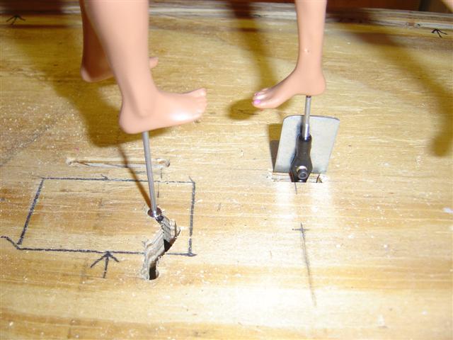 Getting them to move was fairly easy. I had actually bought some DuBro RC parts a while back thinking them to be easier than trying to bend cloth hangers over and over. Turns out they are better, who knew? All I needed to do was some math so that they're motions weren't too drastic. As the motor turns it moves a shaft forward and back. The forward and back attach directly to Kathy so that she rocks about a point, the same shaft also attaches to an arm on a shaft to make Marty rotate. I wanted them on the same shaft so I never had problems with they're sync kissing. Believe it or not, the hardest part was getting the large gage wire up the legs far enough to support them. The female Barbie legs are tiny and thus difficult to get up to the knee without splitting out her leg. That was half a night right there, whew! Here is their first night test on the base. A close up of the feet and an under the cake shot.