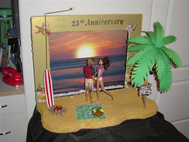Marty and Kathy were married 25 years ago and wanted to celebrate by renewing their vows with the family. We volunteered for the cake once we found some fantastic Barbies in Toys R Us just before the party. Since we had little time it was easier to resurrect the Ariel cake base we still had. Marty and Kathy dated quite a lot on the beach when they first met so that is what we tried to copy.
