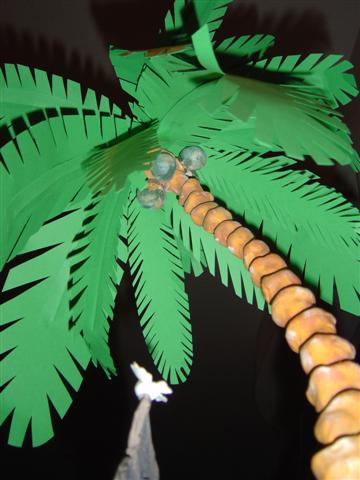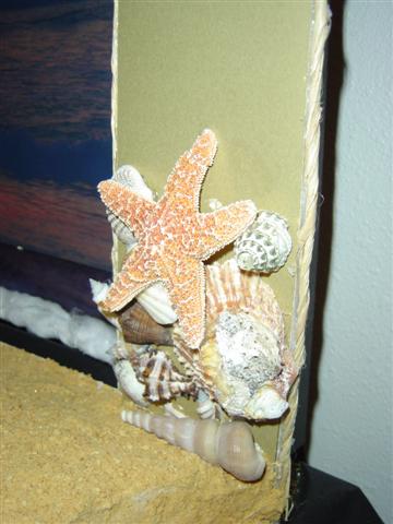 I wanted a sunset background, easy to find on internet and blow up. Done. But I also wanted moving waves. Luckily I'd been holding onto a white opaque plastic paper roll core from work (used on our plotters). They throw them away anyway so I'm glad I kept one. I was able to leave the light from the Ariel cake to light the wave hoping it would look like the sun was showing through (also added yellow color). I used the wave from the sunset and distorted it to fit the roll. Printed it on transparency, laminated it and glued it to the roll. Then hot glued three foam core sections inside the roll each 1/3 of the way around and 1/3 of the length. Added a small amount of rice and sealed it up. When the roll spins the rice catches on the core and drops to form a wavy splash sound. In between splashes enough rice slide across the bottom to add some surf noise as well. NICE! Once I had that working (early I may add) I decided to add some surf to the background. I (luckily) found some decent gears a Radio Shack the next day to link the waves with the surf (to keep them in sync). It was just a wooden dowel with cotton and glitter glued to it. As the wave hit down the surf would come up. And it worked! I seriously doubt anyone noticed the whole background much but I liked it nonetheless. I was working fast by this point so only got two pics at test time :(. 1 2.