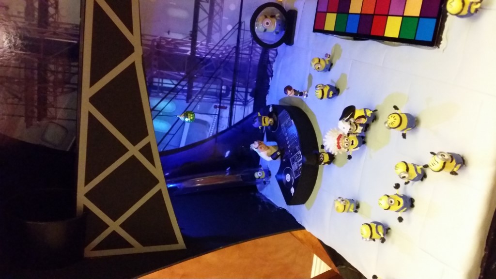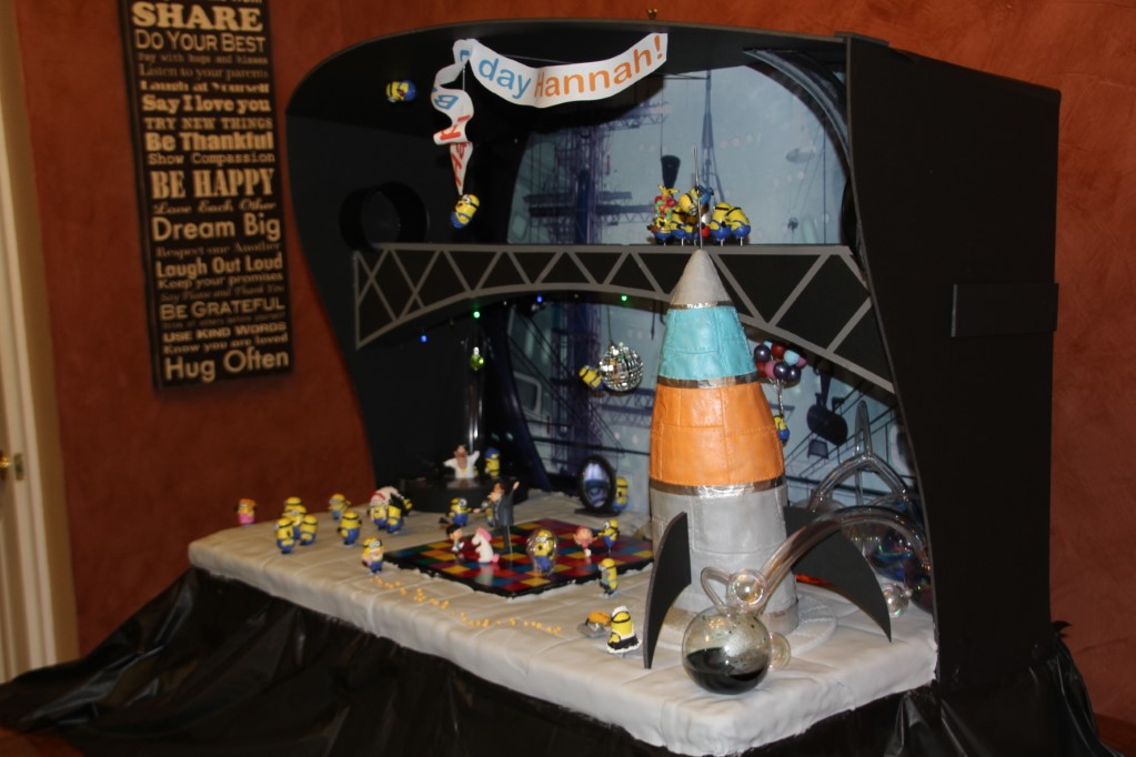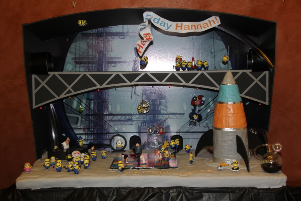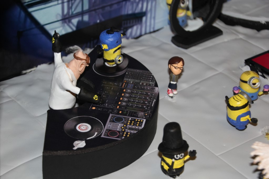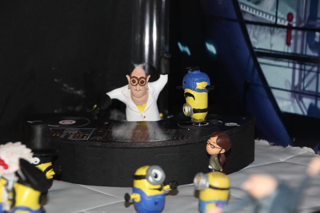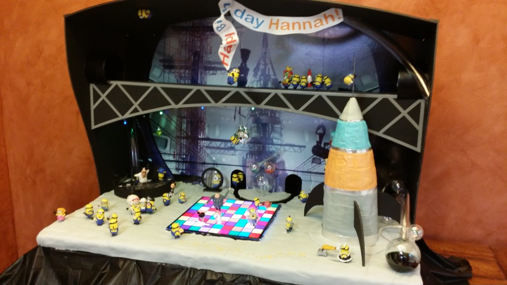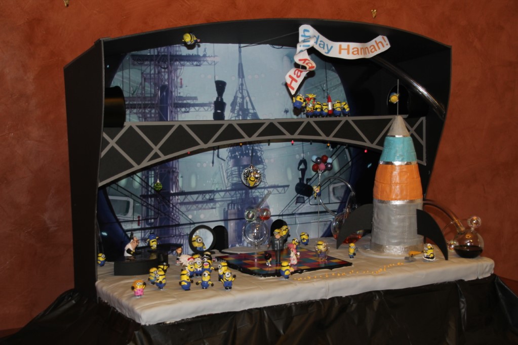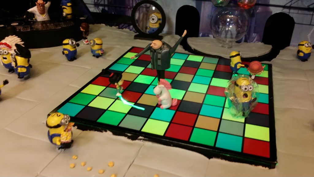 This is a Despicable Me cake for our daughter's 9th birthday. She had a disco dance party this year so I tried to make the cake match the theme. Strangely we decided on Despicable Me after seeing #2, but somehow not a single character from the 2nd movie made it into the cake, except for some minion costumes. The basis is that they are having a birthday dance party of their own in Gru's underground lair. Dr. Nefario is the DJ while Gru, the girls and the minions party. The minions of course are doing their own strange things. One is still floating happily on the ceiling. Another is swinging on the happy birthday sign which broke while he was putting it up. There is a conga line on the upper catwalk which somehow caught a working minion in the line carrying a rocket. See test video. There is one swinging around on the large rocket tip. The maid is cleaning up popcorn from another. The birthday balloons are carrying one minion up off the floor while his friend tries to help him. There are two chasing another that has a giant banana (we like the banana short). Another is spinning on the record player. A group is dancing in front of the DJ. There is a magician trying to show his stuff. The disco ball has a minion stuck on it somehow.