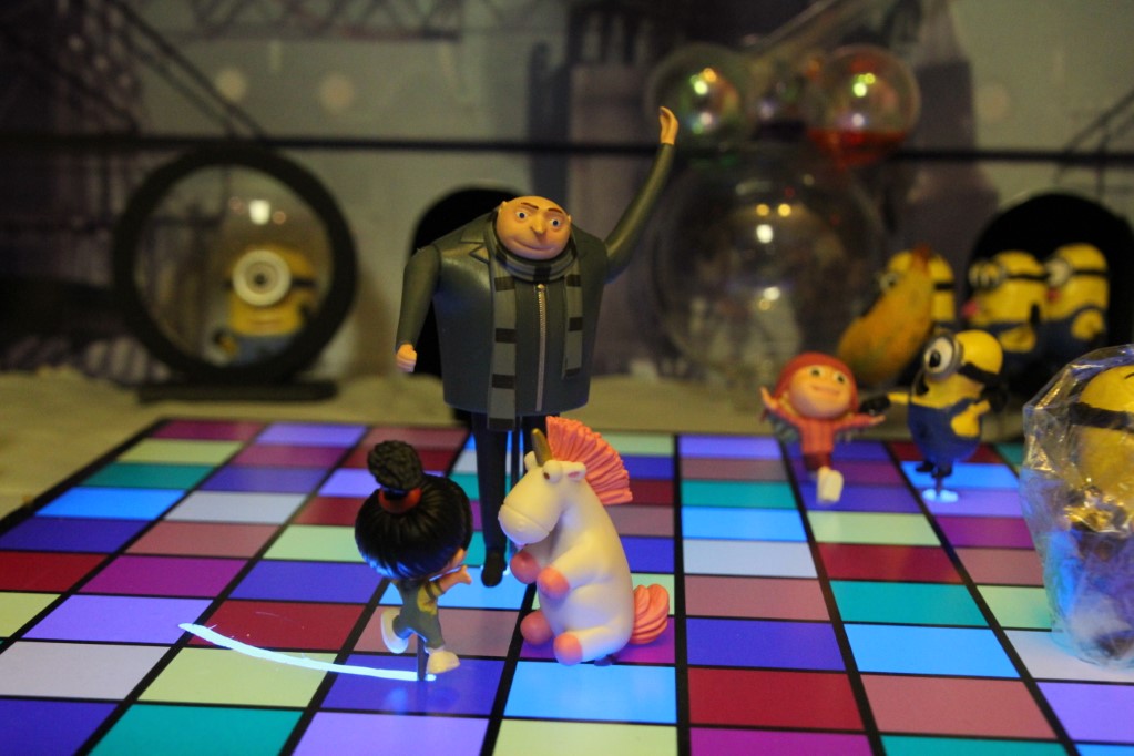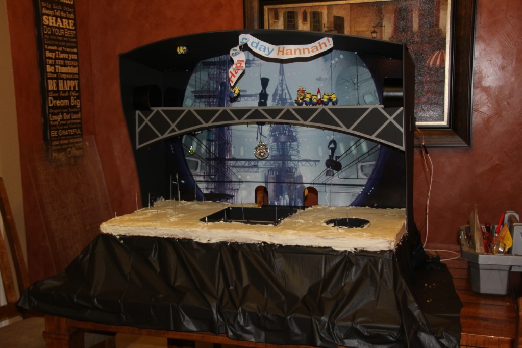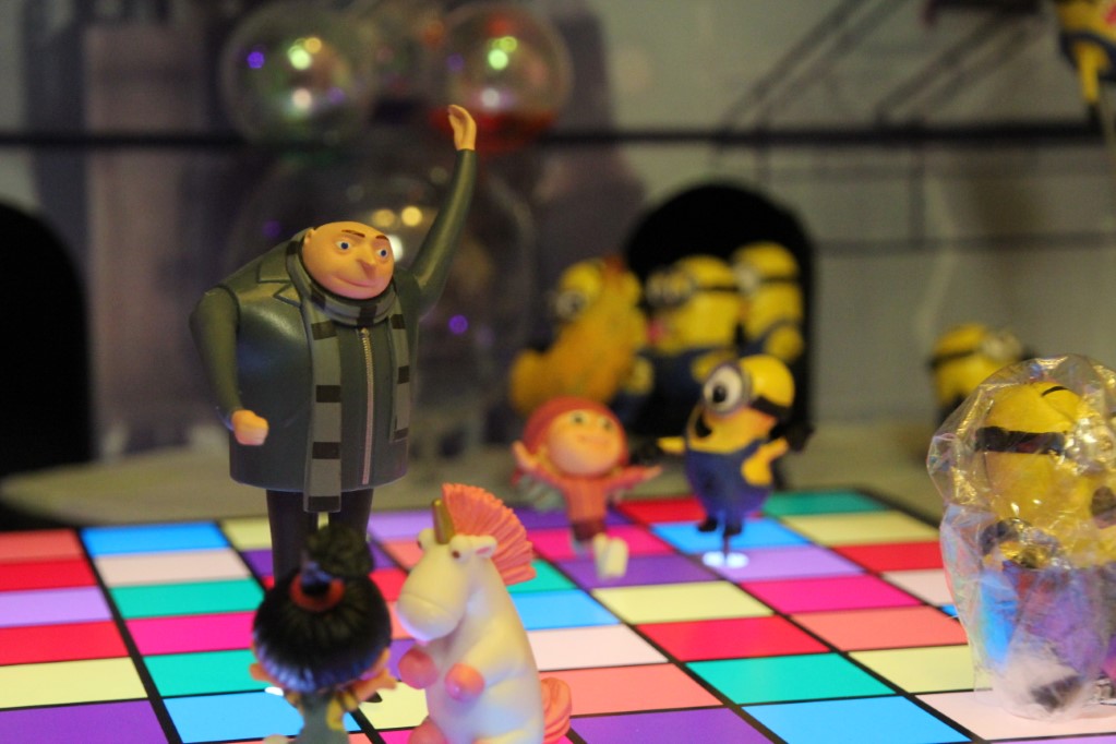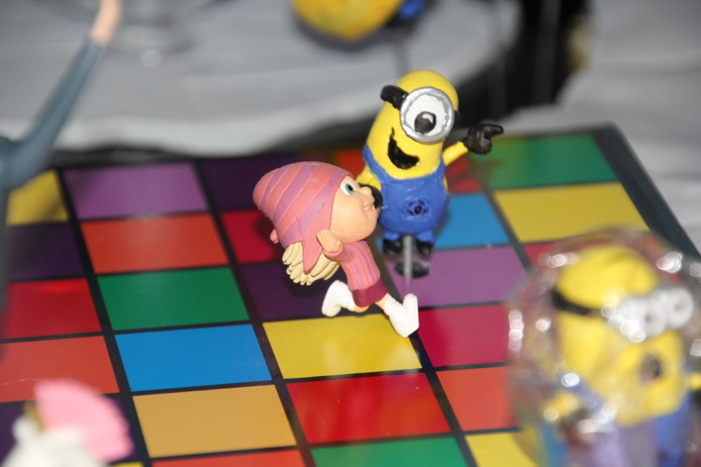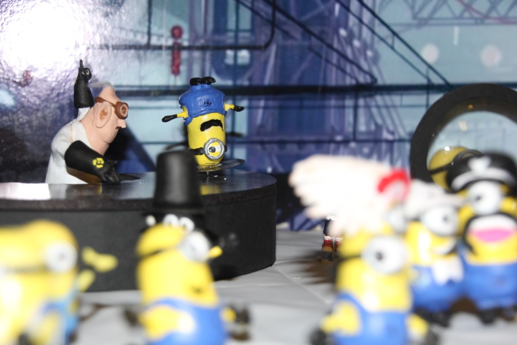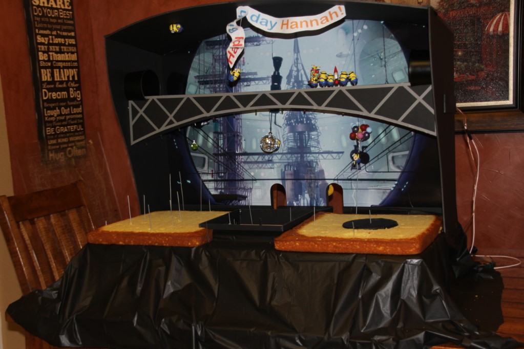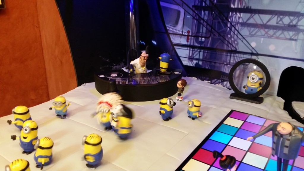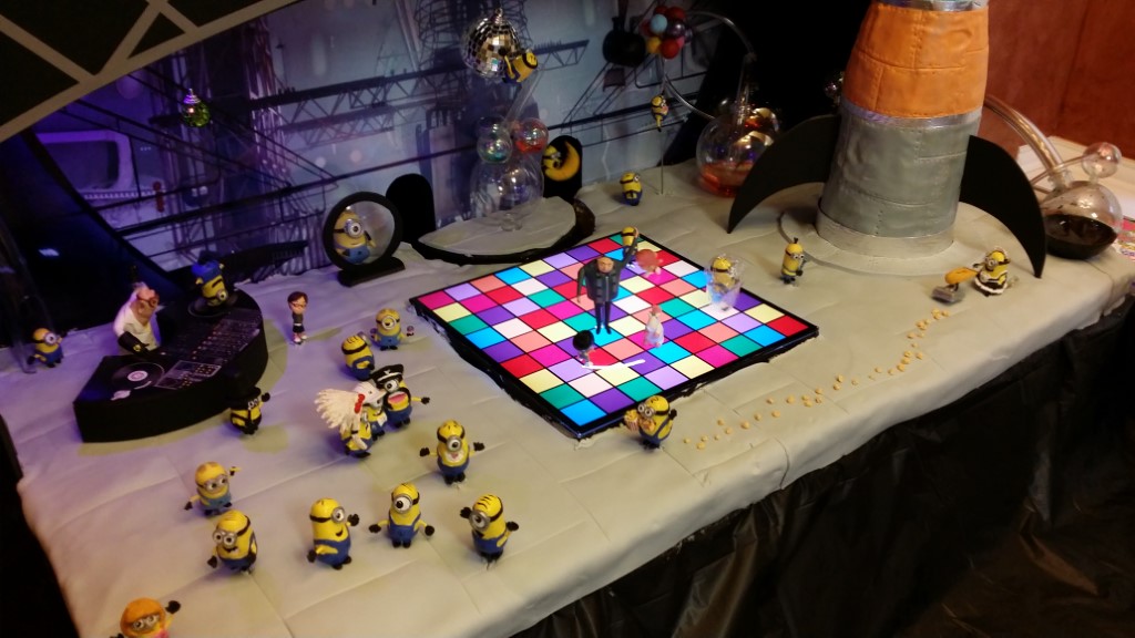 This is a Despicable Me cake for our daughter's 9th birthday. She had a disco dance party this year so I tried to make the cake match the theme. Strangely we decided on Despicable Me after seeing #2, but somehow not a single character from the 2nd movie made it into the cake, except for some minion costumes. The basis is that they are having a birthday dance party of their own in Gru's underground lair. Dr. Nefario is the DJ while Gru, the girls and the minions party. The minions of course are doing their own strange things. One is still floating happily on the ceiling. Another is swinging on the happy birthday sign which broke while he was putting it up. There is a conga line on the upper catwalk which somehow caught a working minion in the line carrying a rocket. See test video. There is one swinging around on the large rocket tip. The maid is cleaning up popcorn from another. The birthday balloons are carrying one minion up off the floor while his friend tries to help him. There are two chasing another that has a giant banana (we like the banana short). Another is spinning on the record player. A group is dancing in front of the DJ. There is a magician trying to show his stuff. The disco ball has a minion stuck on it somehow.