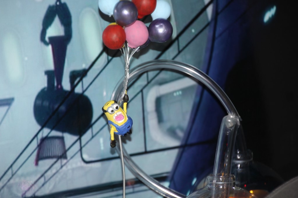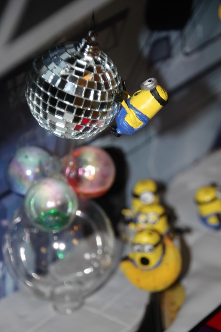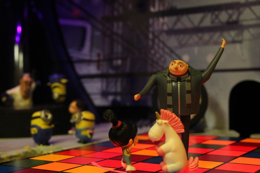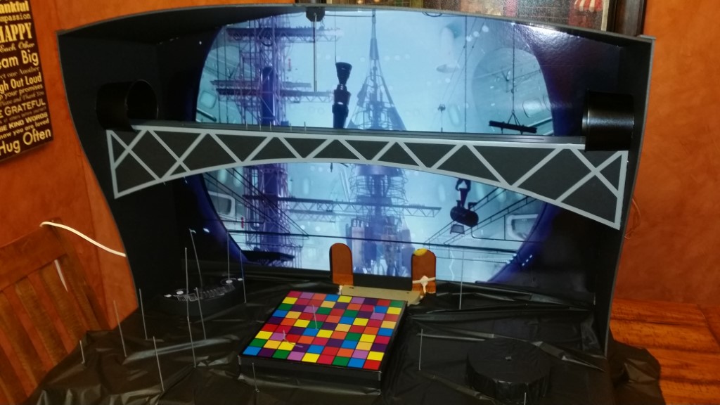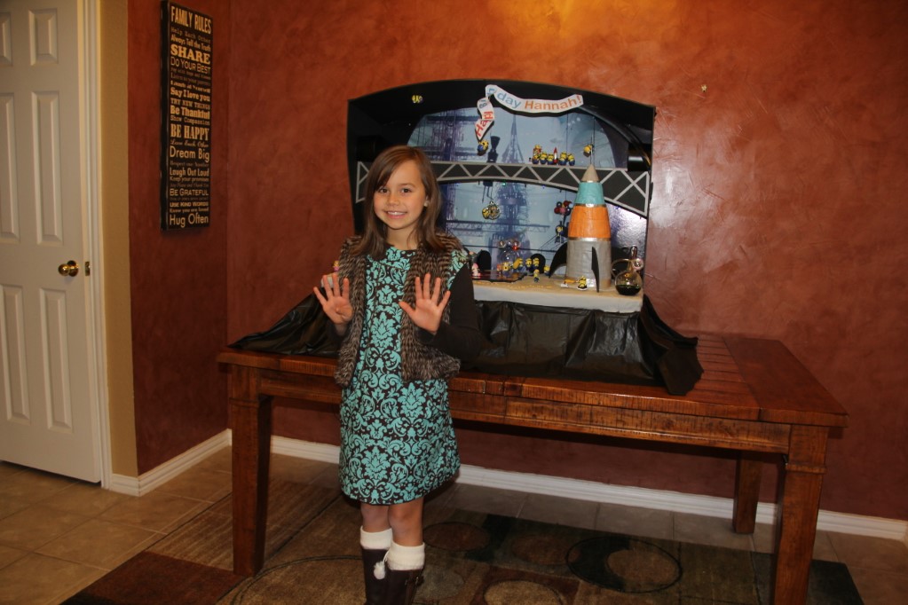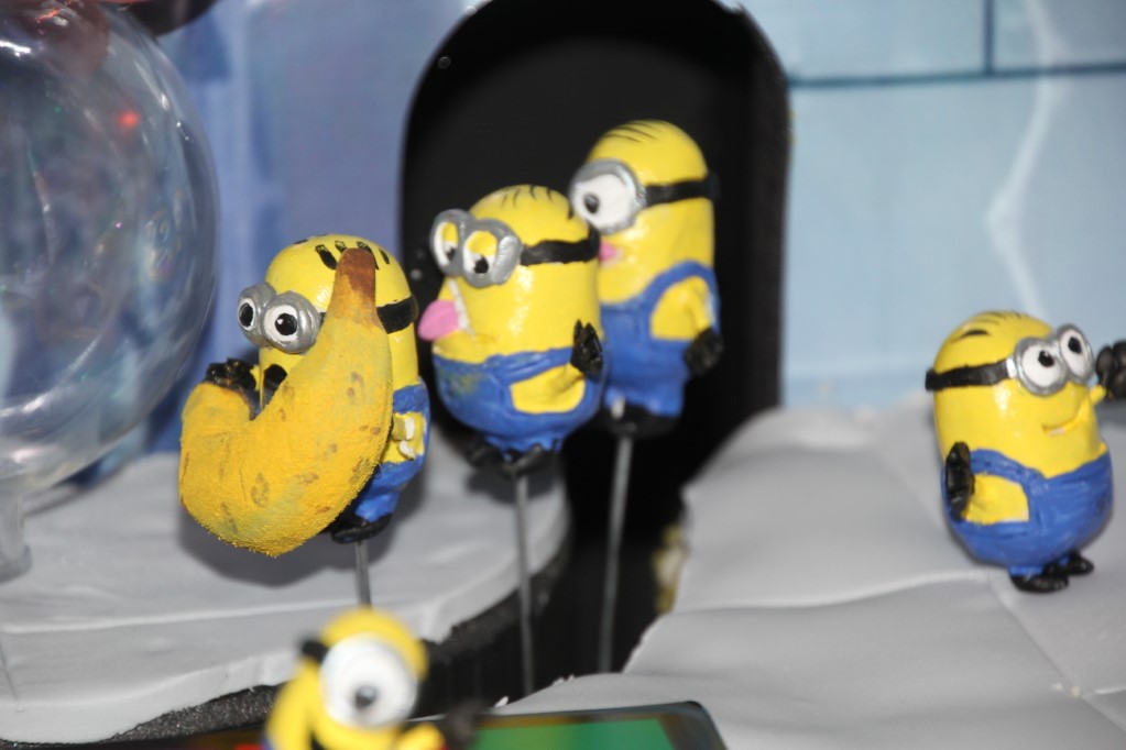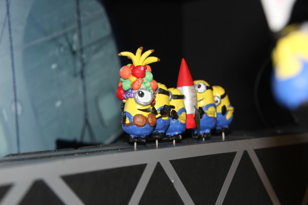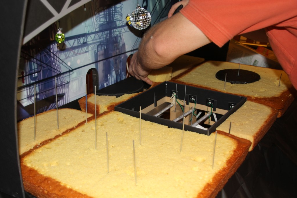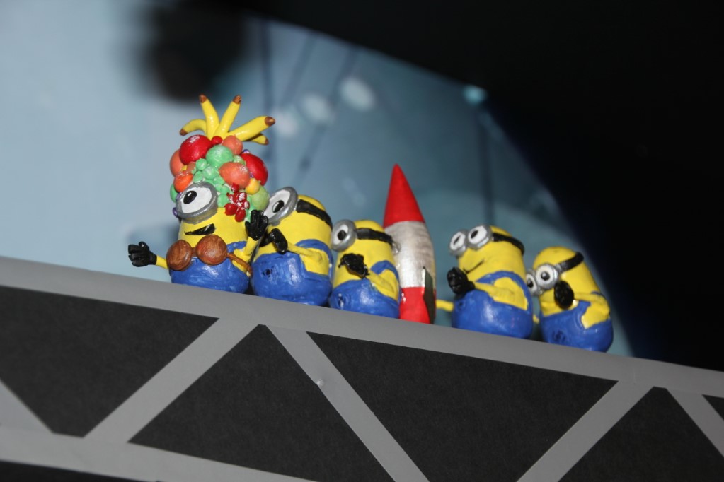 This is a Despicable Me cake for our daughter's 9th birthday. She had a disco dance party this year so I tried to make the cake match the theme. Strangely we decided on Despicable Me after seeing #2, but somehow not a single character from the 2nd movie made it into the cake, except for some minion costumes. The basis is that they are having a birthday dance party of their own in Gru's underground lair. Dr. Nefario is the DJ while Gru, the girls and the minions party. The minions of course are doing their own strange things. One is still floating happily on the ceiling. Another is swinging on the happy birthday sign which broke while he was putting it up. There is a conga line on the upper catwalk which somehow caught a working minion in the line carrying a rocket. See test video. There is one swinging around on the large rocket tip. The maid is cleaning up popcorn from another. The birthday balloons are carrying one minion up off the floor while his friend tries to help him. There are two chasing another that has a giant banana (we like the banana short). Another is spinning on the record player. A group is dancing in front of the DJ. There is a magician trying to show his stuff. The disco ball has a minion stuck on it somehow.