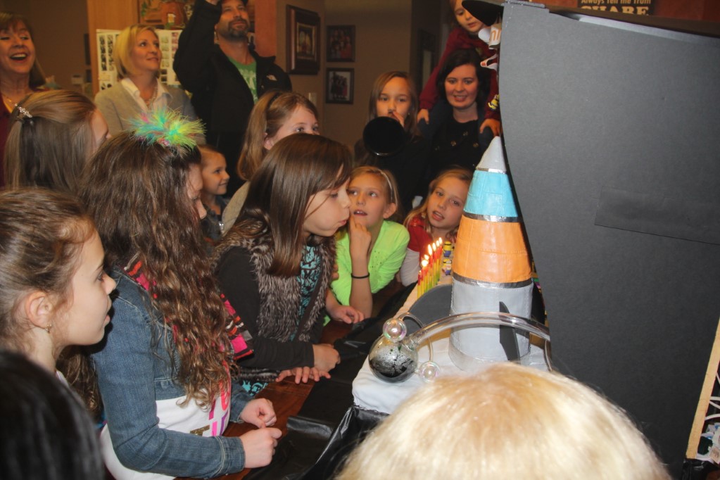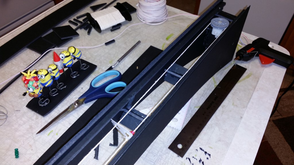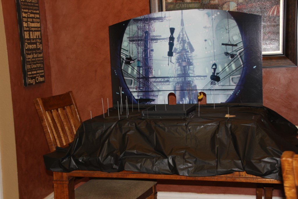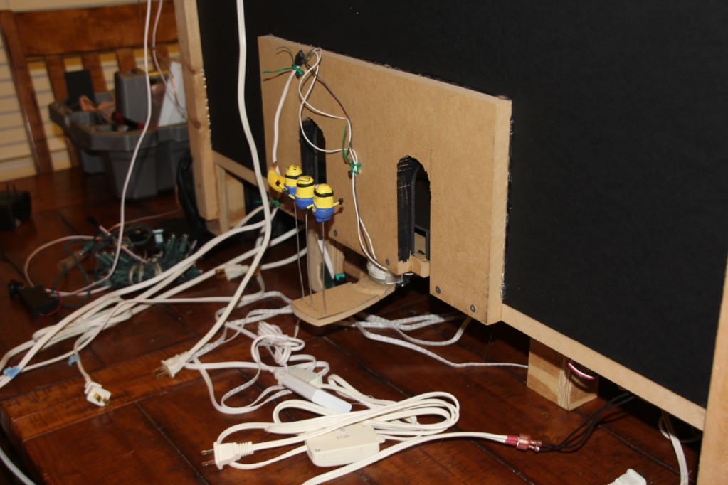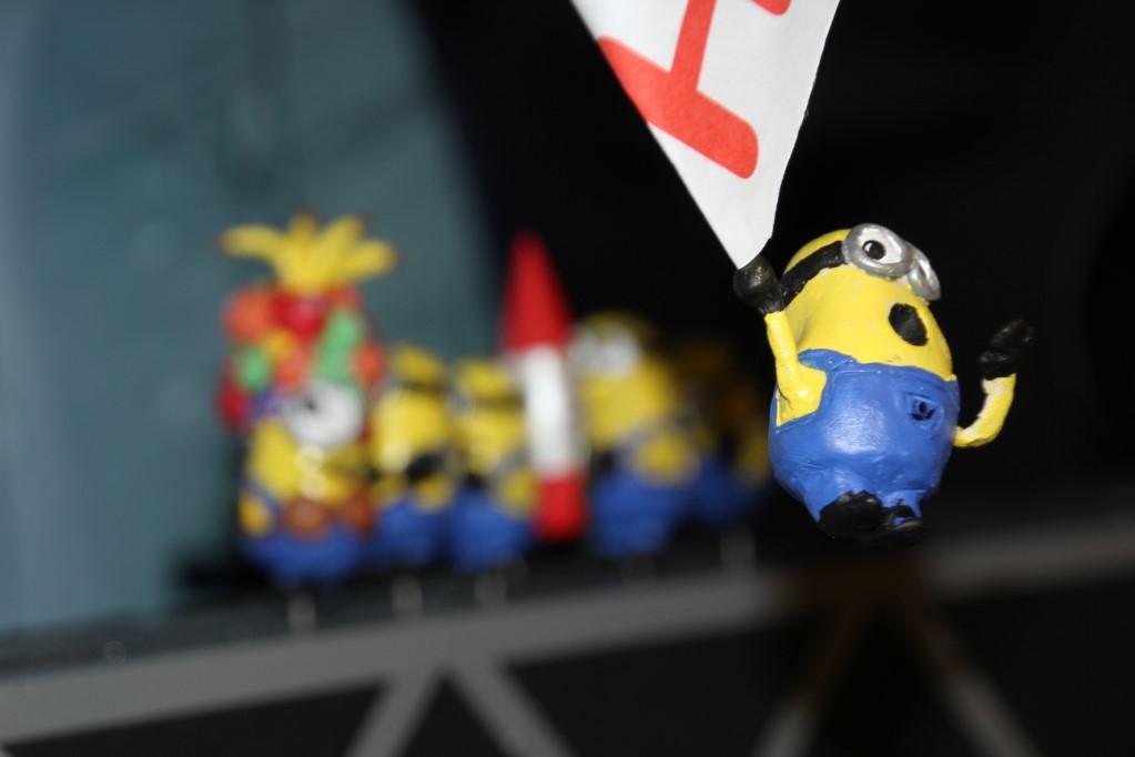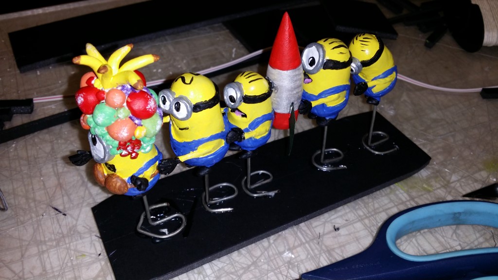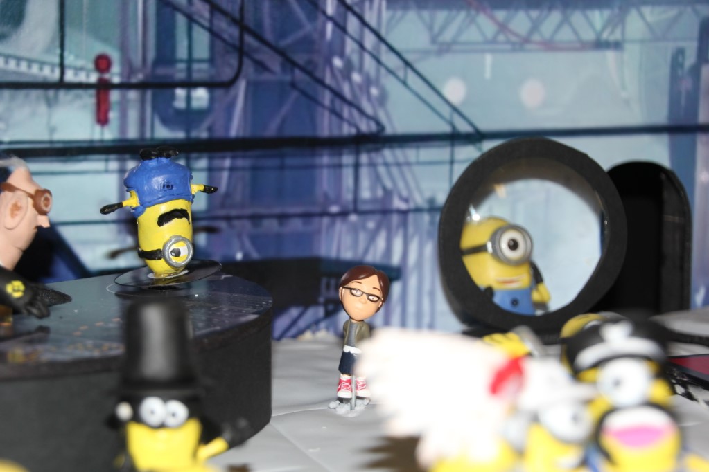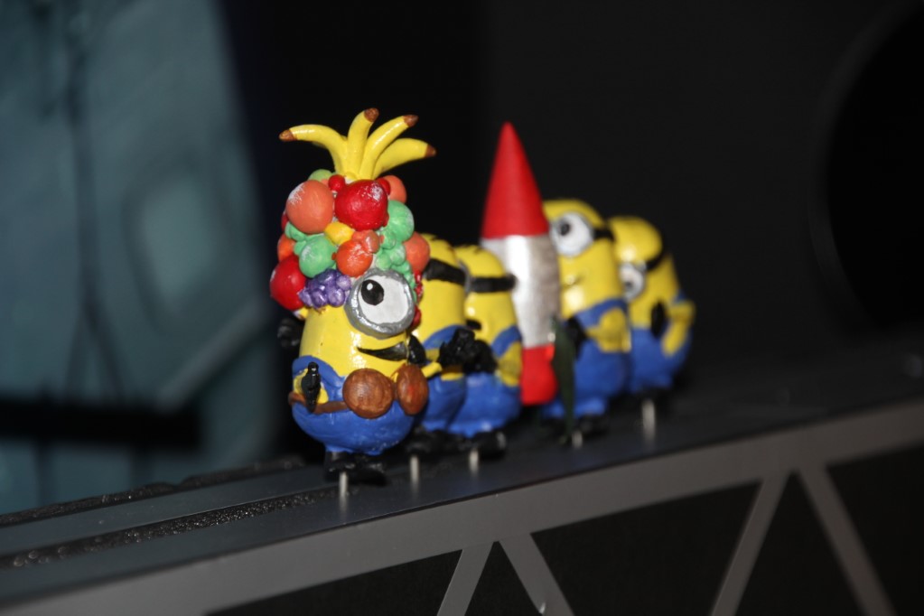 This is a Despicable Me cake for our daughter's 9th birthday. She had a disco dance party this year so I tried to make the cake match the theme. Strangely we decided on Despicable Me after seeing #2, but somehow not a single character from the 2nd movie made it into the cake, except for some minion costumes. The basis is that they are having a birthday dance party of their own in Gru's underground lair. Dr. Nefario is the DJ while Gru, the girls and the minions party. The minions of course are doing their own strange things. One is still floating happily on the ceiling. Another is swinging on the happy birthday sign which broke while he was putting it up. There is a conga line on the upper catwalk which somehow caught a working minion in the line carrying a rocket. See test video. There is one swinging around on the large rocket tip. The maid is cleaning up popcorn from another. The birthday balloons are carrying one minion up off the floor while his friend tries to help him. There are two chasing another that has a giant banana (we like the banana short). Another is spinning on the record player. A group is dancing in front of the DJ. There is a magician trying to show his stuff. The disco ball has a minion stuck on it somehow.