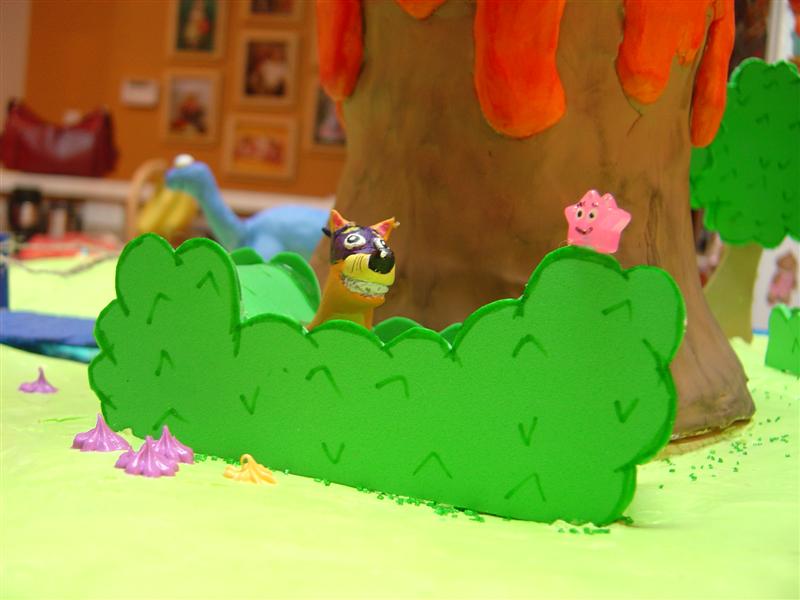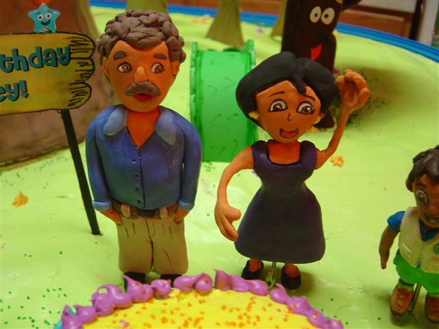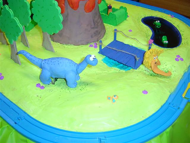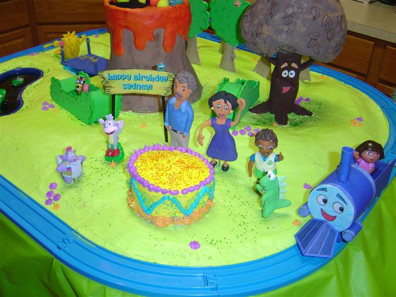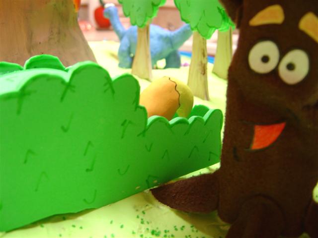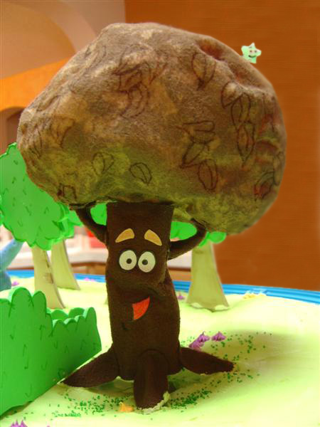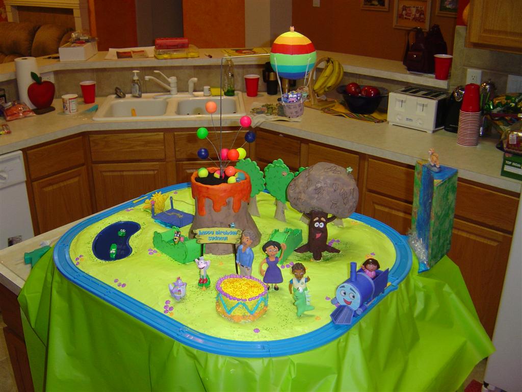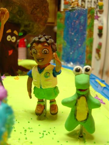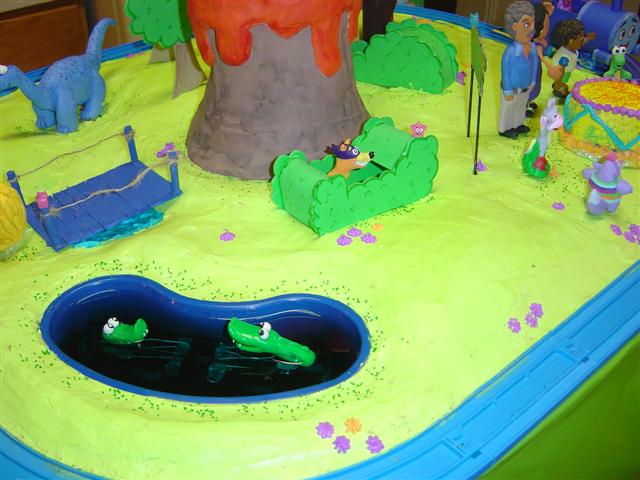 The second goal was also that the viewer would see something new each time they passed by the cake. The cake is the grass underneath everything. Not much actual cake decoration here. Since we are not great decorators we make up with moving flare :). The cake is set up so that Dora moves around the cake seeing each of the characters she knows. The party consists of Boots, Papi, Mami, Diego, Tico and Isa standing around Sydney's cake. Next to the party, on either side, Swiper alternately pops out of the bushes. The Chocolate Tree dances in the background and Baby Jaguar hops up and down on the waterfall. The crocodiles pop out of the water on Crocodile Lake. The Grumpy Old Troll does his dance in front of his bridge. Baby dino rocks his head and tail back and forth to the music. Benny the Bull flies above all in his balloon fixed with sticky tape. The Gooey Geyser shooting out bouncy balls sets in the center. You may also notice 8 stars hidden around the cake.