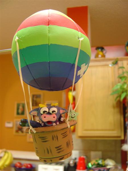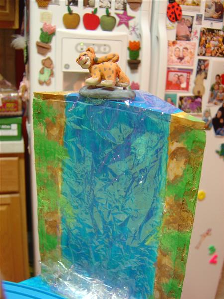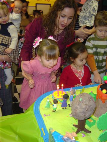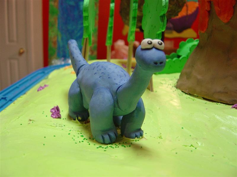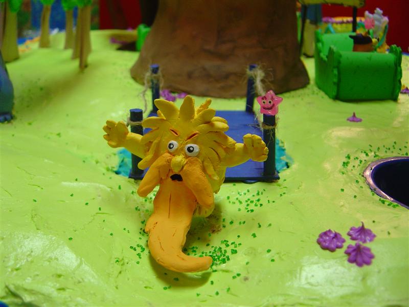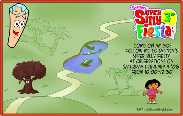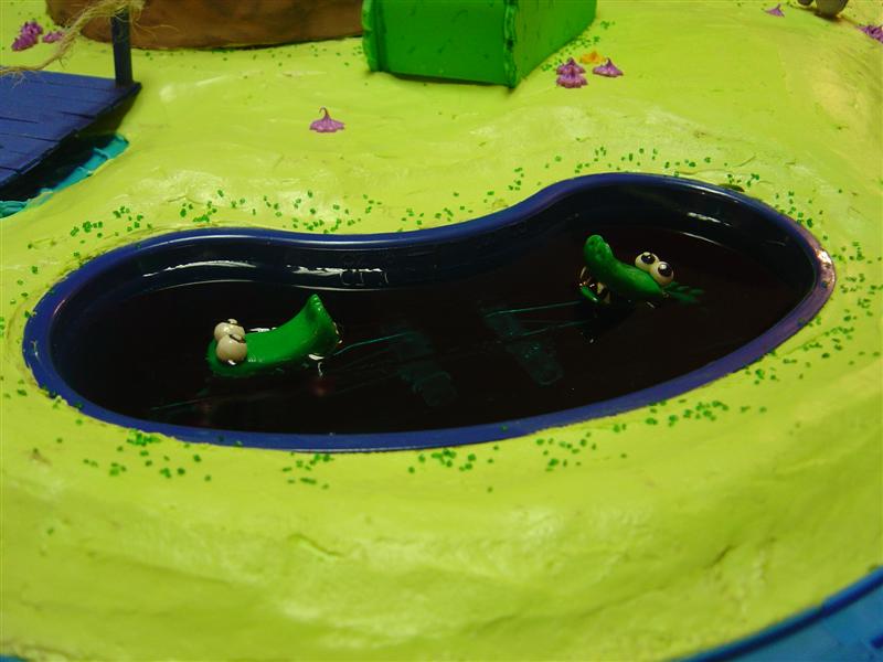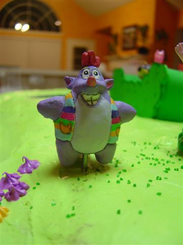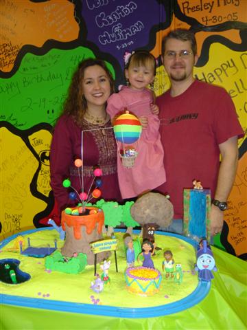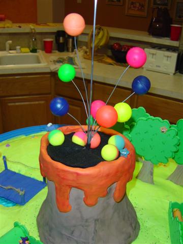 The second goal was also that the viewer would see something new each time they passed by the cake. The cake is the grass underneath everything. Not much actual cake decoration here. Since we are not great decorators we make up with moving flare :). The cake is set up so that Dora moves around the cake seeing each of the characters she knows. The party consists of Boots, Papi, Mami, Diego, Tico and Isa standing around Sydney's cake. Next to the party, on either side, Swiper alternately pops out of the bushes. The Chocolate Tree dances in the background and Baby Jaguar hops up and down on the waterfall. The crocodiles pop out of the water on Crocodile Lake. The Grumpy Old Troll does his dance in front of his bridge. Baby dino rocks his head and tail back and forth to the music. Benny the Bull flies above all in his balloon fixed with sticky tape. The Gooey Geyser shooting out bouncy balls sets in the center. You may also notice 8 stars hidden around the cake.