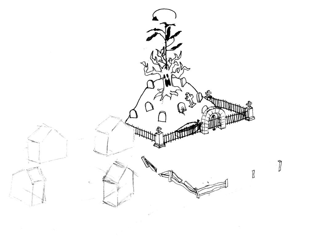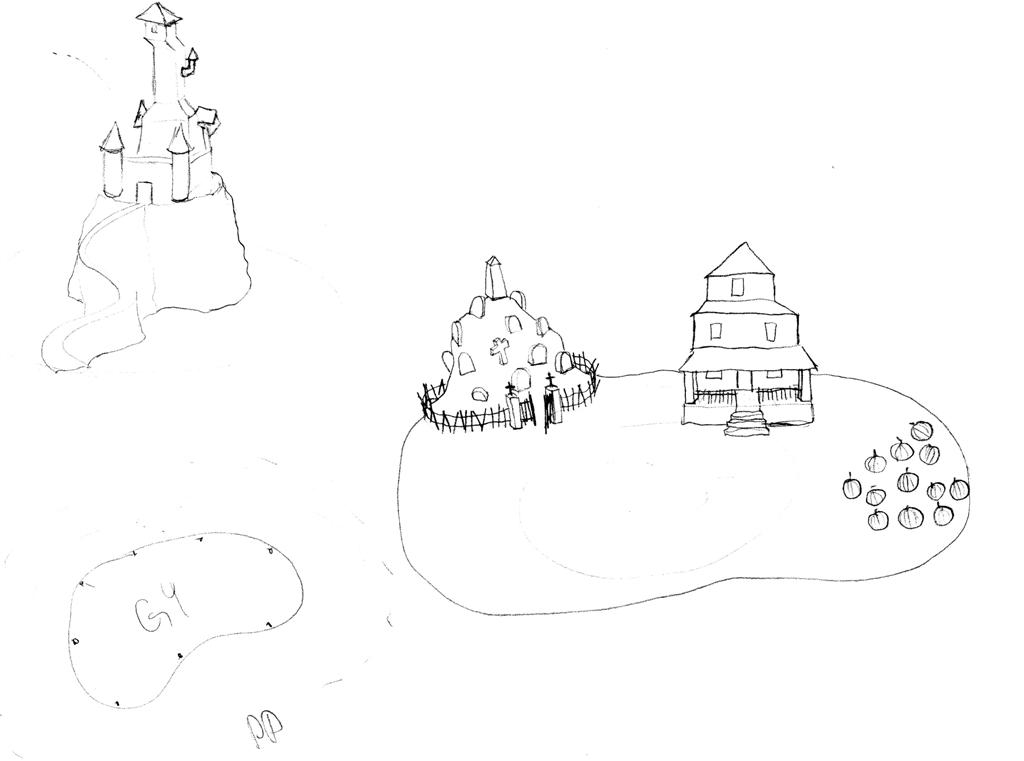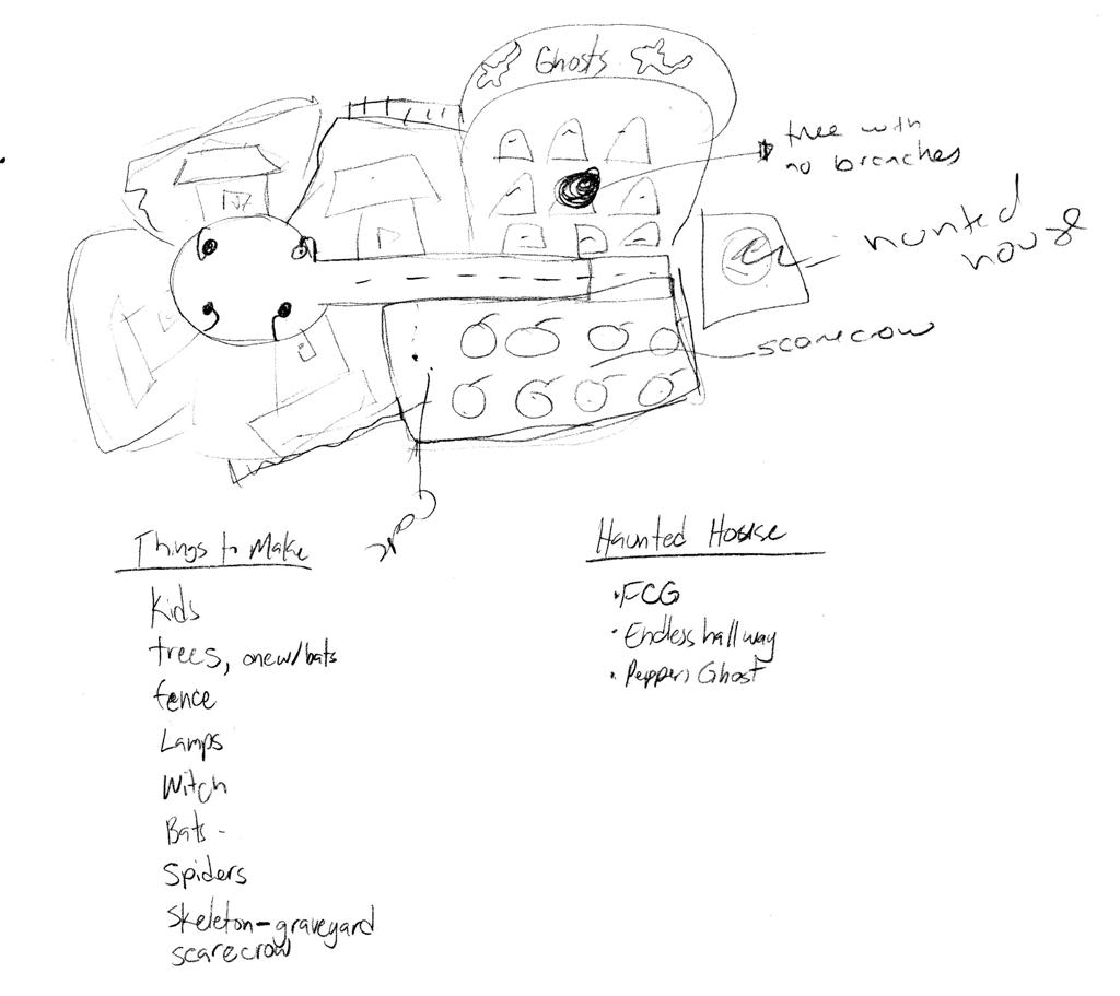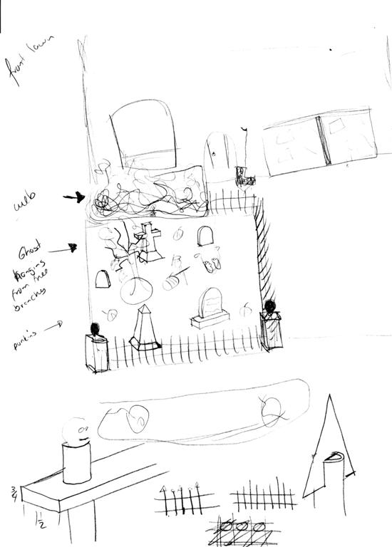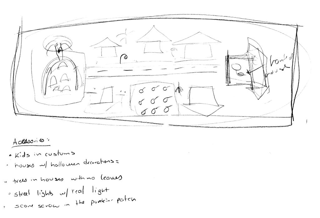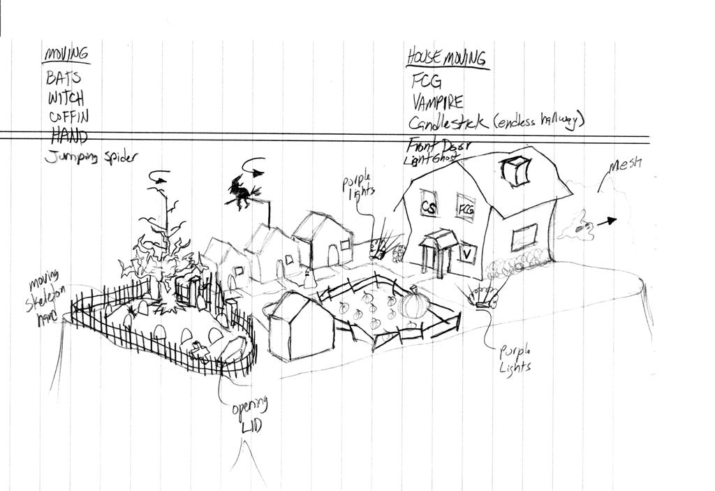 12 pounds of fondant! This is Hannah's 2nd birthday cake. Even though her birthday is in November we decided on a Halloween theme because she has no choice yet and it sounded fun. The cake portion is the 4 small houses and the pumpkin patch. Hannah's piece of the cake is the large pumpkin in the patch. Everything else is cardboard, foam, tape, glue, paper, clay, Polly Pockets toys, Lemax lighting, wood, motors, string, wire, epoxy, metal you name it. We have about 16,256 sketches of the cake. Here are a few 1, 2, 3, 4, 5, 6, 7, 8, 9. It took us a while to decide what to make. There are so many Halloween ideas out there. I made the mistake of looking online to see what people make for their Halloween decorations. Wow, so many great ideas out there. Took me a week of reading about other projects to finally give up and go back to our cake. It was a good thing, we ended up making some outdoor decorations ourselves for the party which can also be used for years to come.