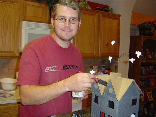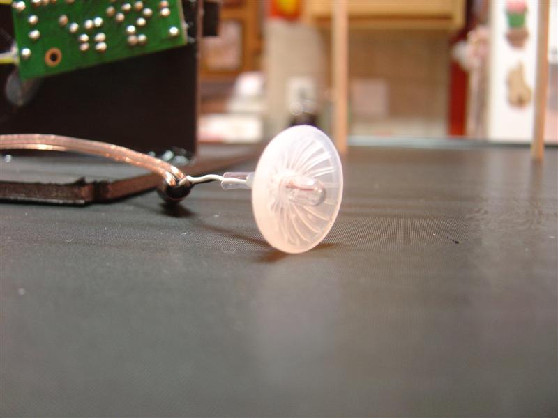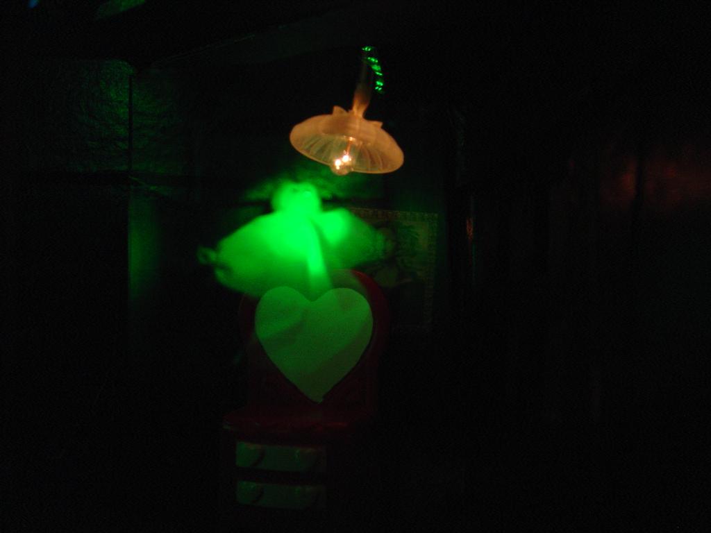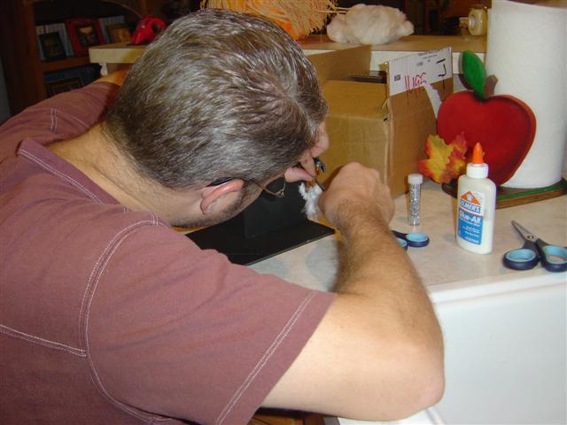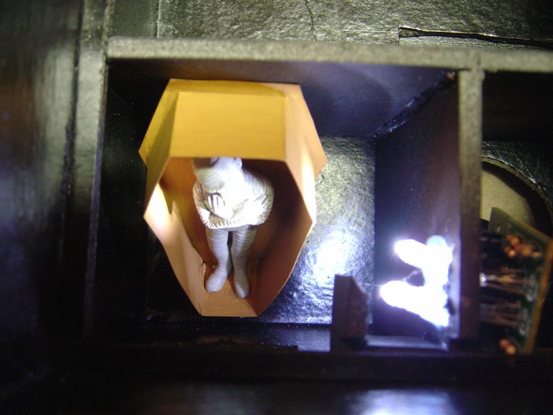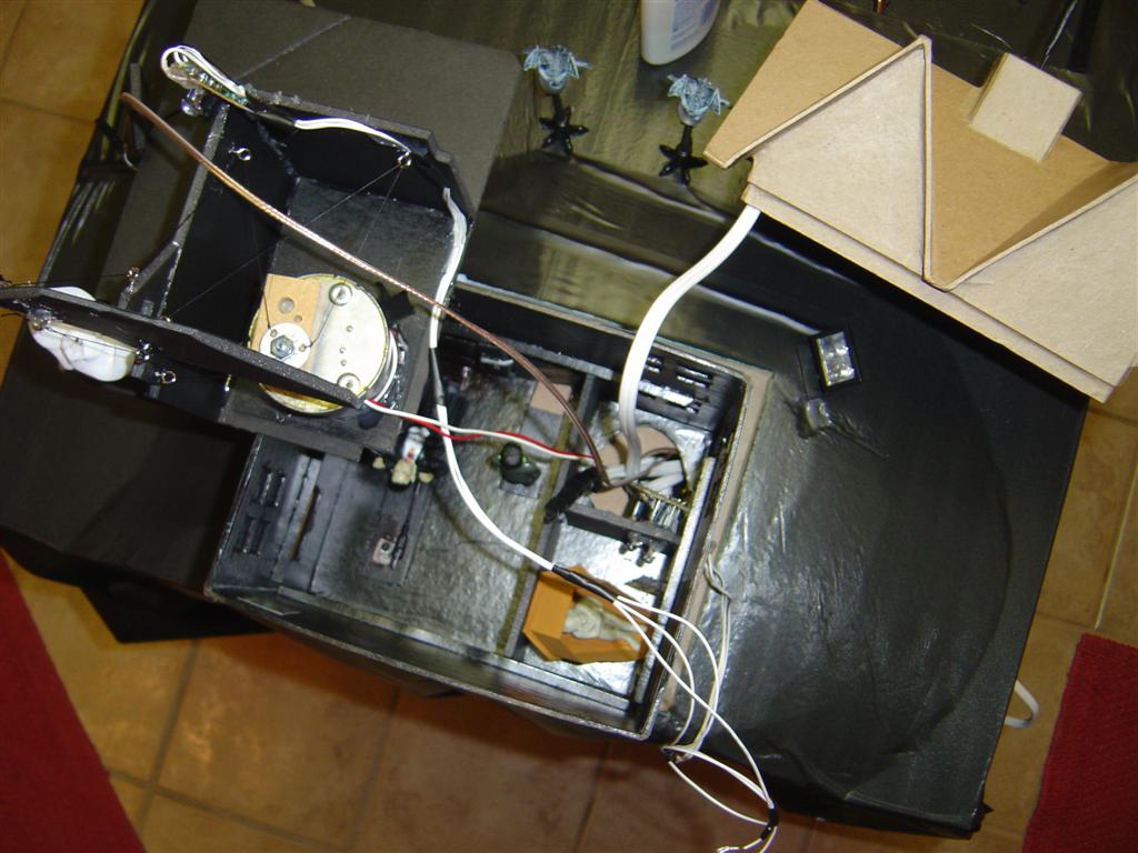Here are some production pics. We got very few pictures this time as we seemed to always be behind schedule. Making the Haunted Tree from Sculpey clay. Testing the mummy strobe lights,, got a small variable LED strobe kit soldered together here. Making the lamp in the haunted house that will light the dresser and picture (thanks to Jexer for the lamp shade). The FCG hooked up to the motor without any skin. Hooking the FCG up with it's test feathers, no good. Lighting is secure, getting ready for fondant. Baking the cakes. Getting ready to put the completed second floor in the haunted house (this is looking down with the second floor setting on top of the house). Testing the finished Flying Crank Pepper's Ghost in the house. The night before the party, frosting time, how late is it?