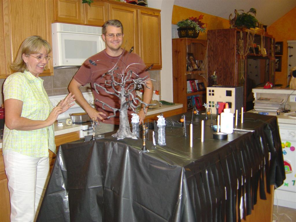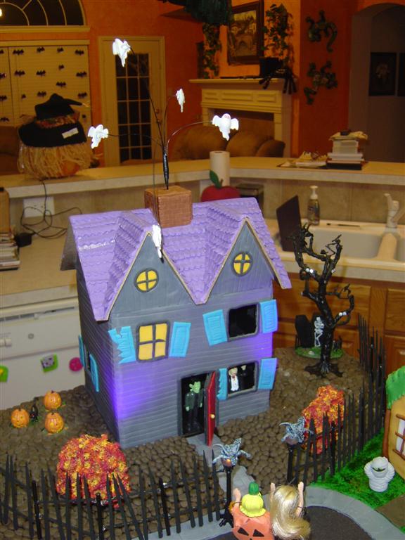 The bats and ghosts are just hooked straight to shafts hooked to motors. Very easy. More difficult to run the shaft up the tree but we got it no problem. Lili molded the witch flying around the middle house. Turned out really cute I thought. Again, hooked directly to a motor below the cake. The tree was originally going to be a Lemax spooky tree but it wasn’t nearly big enough for what we wanted so we molded our own. Just wish I’d thought of that ahead of time and added some glowing eyes. I didn’t have any tiny LEDs around the night we made that decision L. Yep, I need to stock up on more junk, just in case.