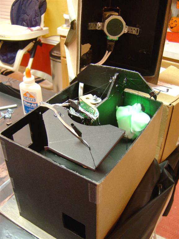 I also really like the jumping spider on the pumpkin. Very easy really. A 3 rpm motor with and spring piece of metal rotates below. The spider has a wire (rod) going down through the cake that lines up with the springy metal. There is a bracket that blocks the springy metal as the motor rotates toward the rod. Once the motor goes so far the spring finally pops off of the bracket and pops the spider’s rod which shoots him up. So he jumps about every 20 seconds.