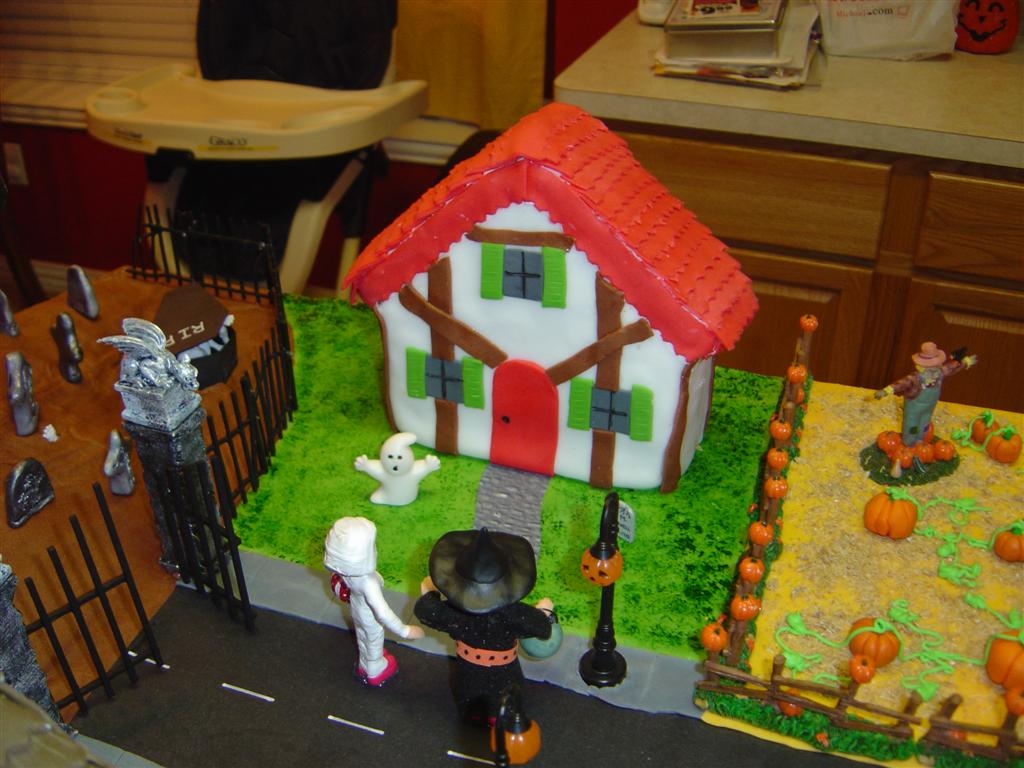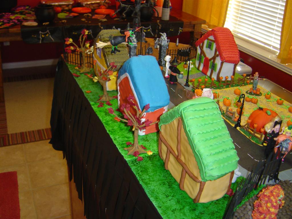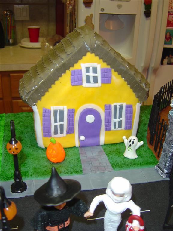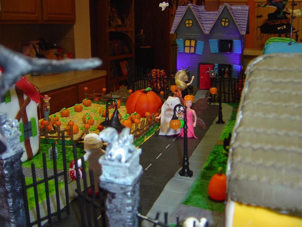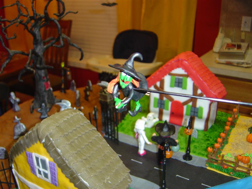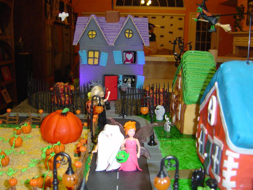 Most of stuff we made but we did cheat this time and bought some Lemax miniature stuff for lighting the streets around the town and the fence around the pumpkin patch and gargoyles (we made the pillars). The kids are actually Polly Pockets with their legs cut off to shorten them. Then Lili made costumes for each child for the Halloween celebration. The mummy, franky and dracula we got at the dollar store as well. With so much other junk to do for this party it really made it easier to buy some of the accessories (we decorated the yard as well).We were able to use Halloween rings for the ghosts and bats. The skeleton in the coffin was ripped off of a Halloween straw. I think everything else we made on the cake, there was still a lot to do, really.