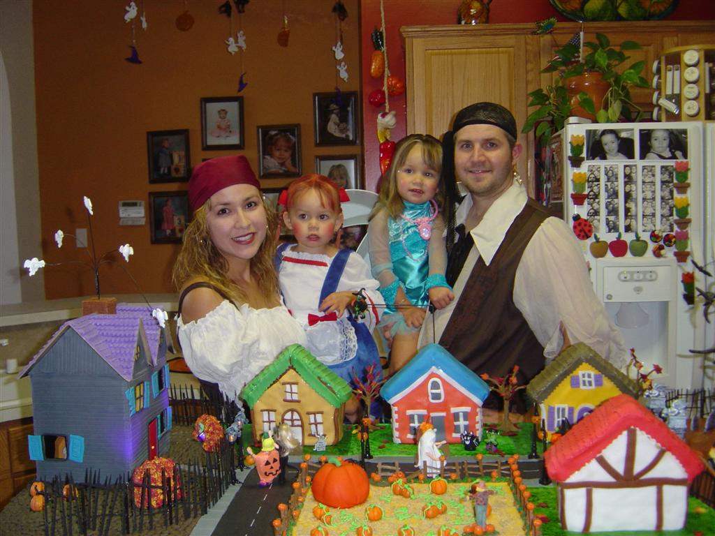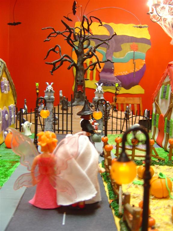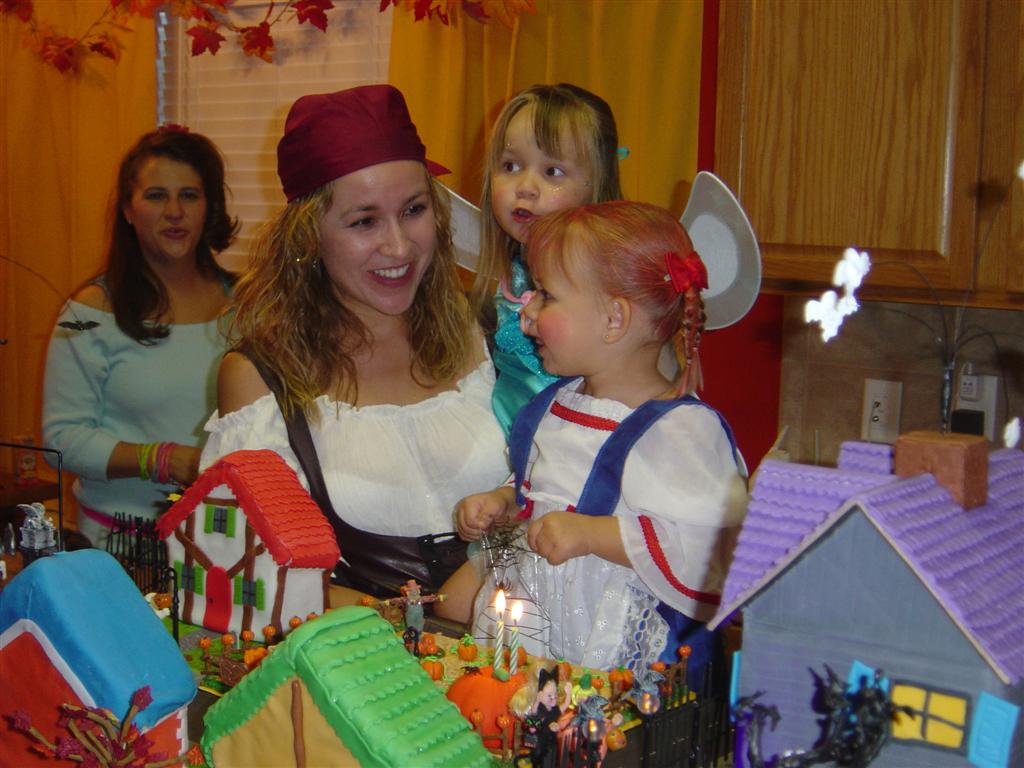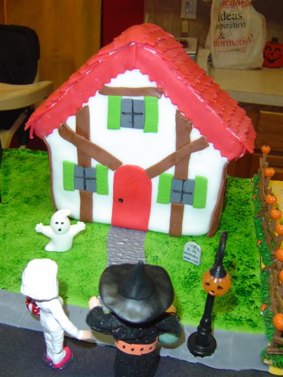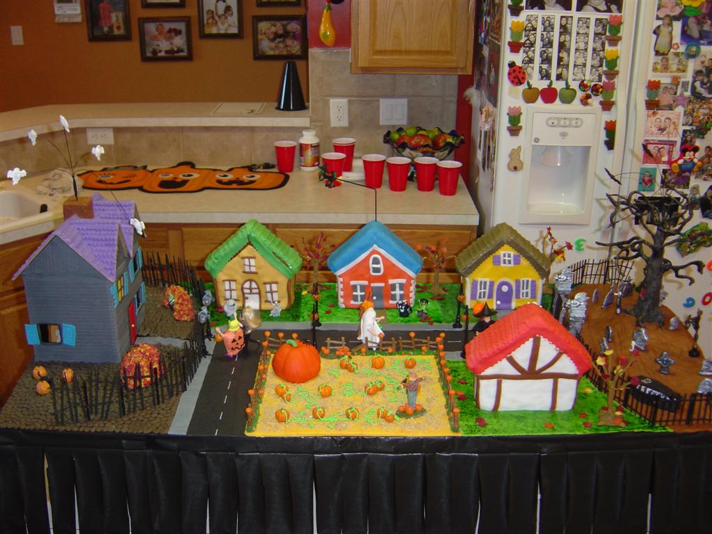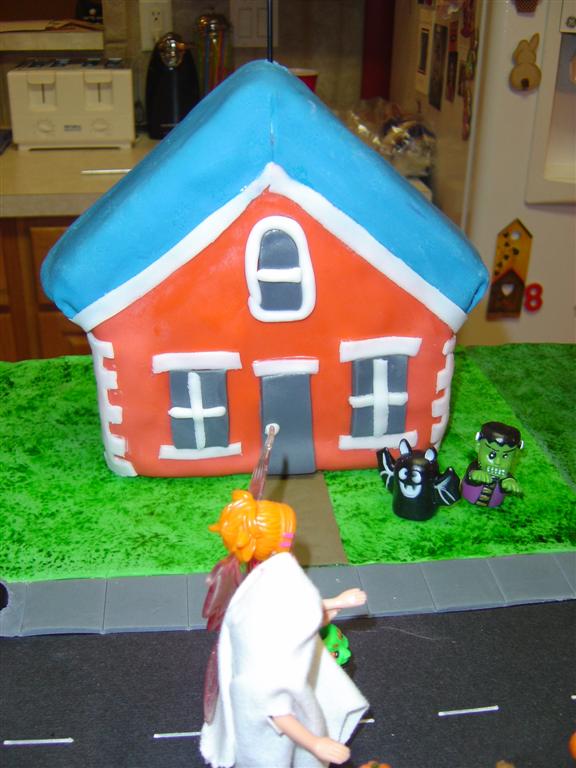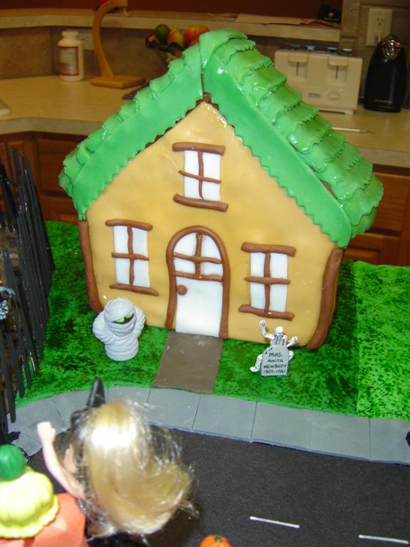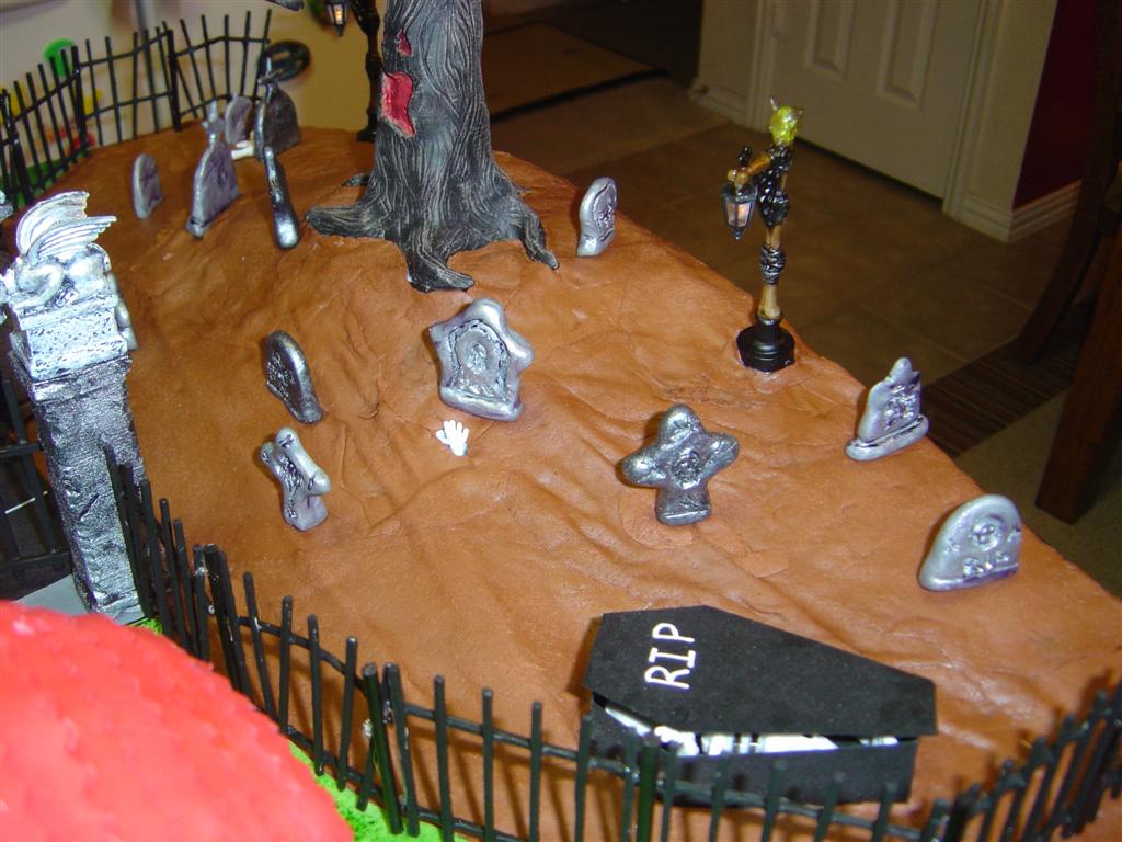 Most of stuff we made but we did cheat this time and bought some Lemax miniature stuff for lighting the streets around the town and the fence around the pumpkin patch and gargoyles (we made the pillars). The kids are actually Polly Pockets with their legs cut off to shorten them. Then Lili made costumes for each child for the Halloween celebration. The mummy, franky and dracula we got at the dollar store as well. With so much other junk to do for this party it really made it easier to buy some of the accessories (we decorated the yard as well).We were able to use Halloween rings for the ghosts and bats. The skeleton in the coffin was ripped off of a Halloween straw. I think everything else we made on the cake, there was still a lot to do, really.