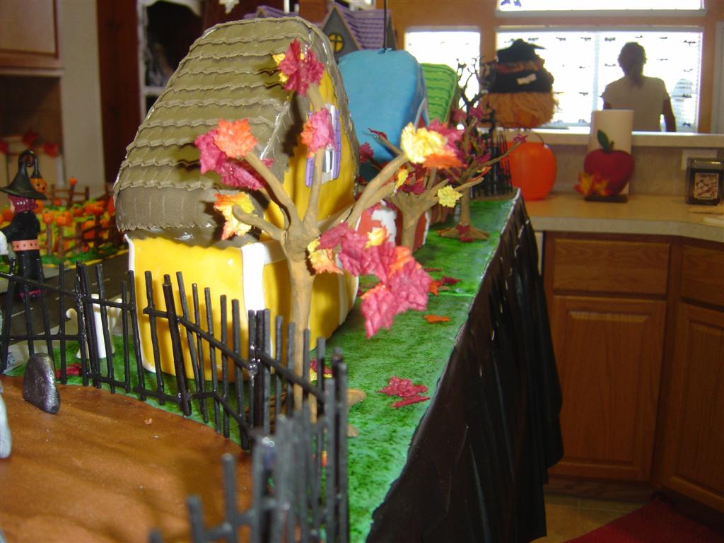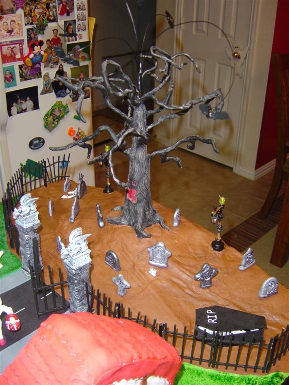 The 4 houses were baked with Wilton’s house pan. It makes a decent base for a house. We wanted them to all look different, and they do. The pumpkin patch is sunk so that we could add a chocolate cake here. We were hoping to hide a cake there so the entire ground looked the same. So, all of the ground is fondant. We also covered the haunted house with fondant to keep continuity with the other houses. The goal was to be a bit spookier but we really ran out of time the night before the party. BTW, those “rocks” you see around the yard of the haunted house took 2 of us about 2 ½ hours to make. Never thought it would take that long. The bushes that hide the purple lights are made from a sponge and painted to look like fall bushes. The hills that the graveyard and haunted house set on are foam used for walls. I glued together sheets of ¾” foam then cut with the band saw and final formed with a knife and sandpaper. Lili made all of the gravestones from clay. I used the scrap from this to make the pillars for the gargoyles. The small trees and pumpkins were also made from clay.