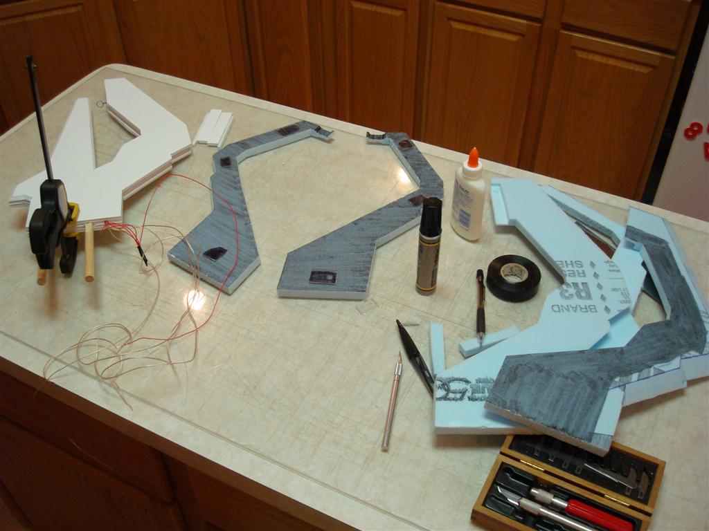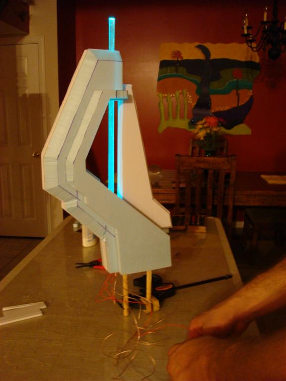 After I knew the Warthog would work and I had some code for my shiny Prop-1 board. I had to get to work on the base. I mocked up the base in 3D software base on a couple images online. The Halo 3 beta just ended after I'd decided what I wanted so I wasn't able to hop in the game for further inspection. Ah well, it's my own level anyway. From the 3D render I plotted off some templates of cross sections. From these I cut out foamcore and styrofoam to make the base. I mixed 2 green and 2 blue LEDs for a teal color. Here is a test shot of the base assembled with lights installed. I did have the side panels set away from the structure as I remember it but once it came down to fondant frosting, the weight made it sound like a bad idea so I glued them all together instead.