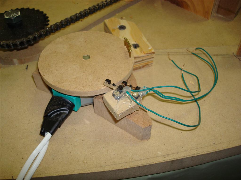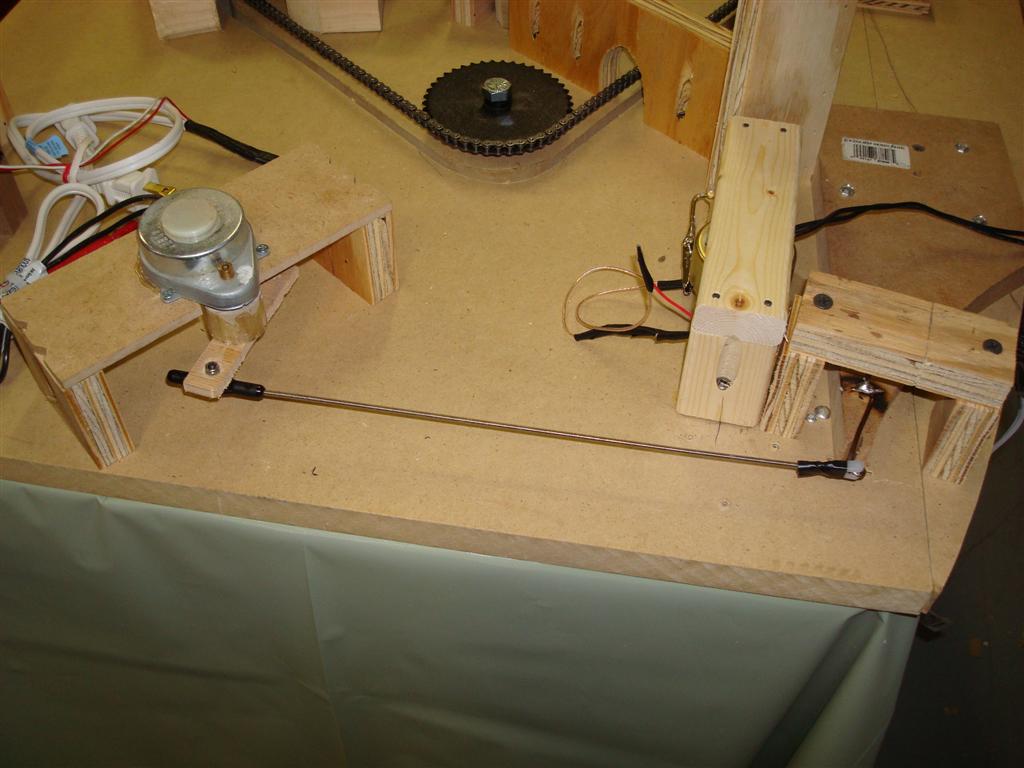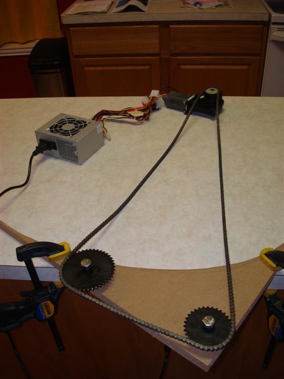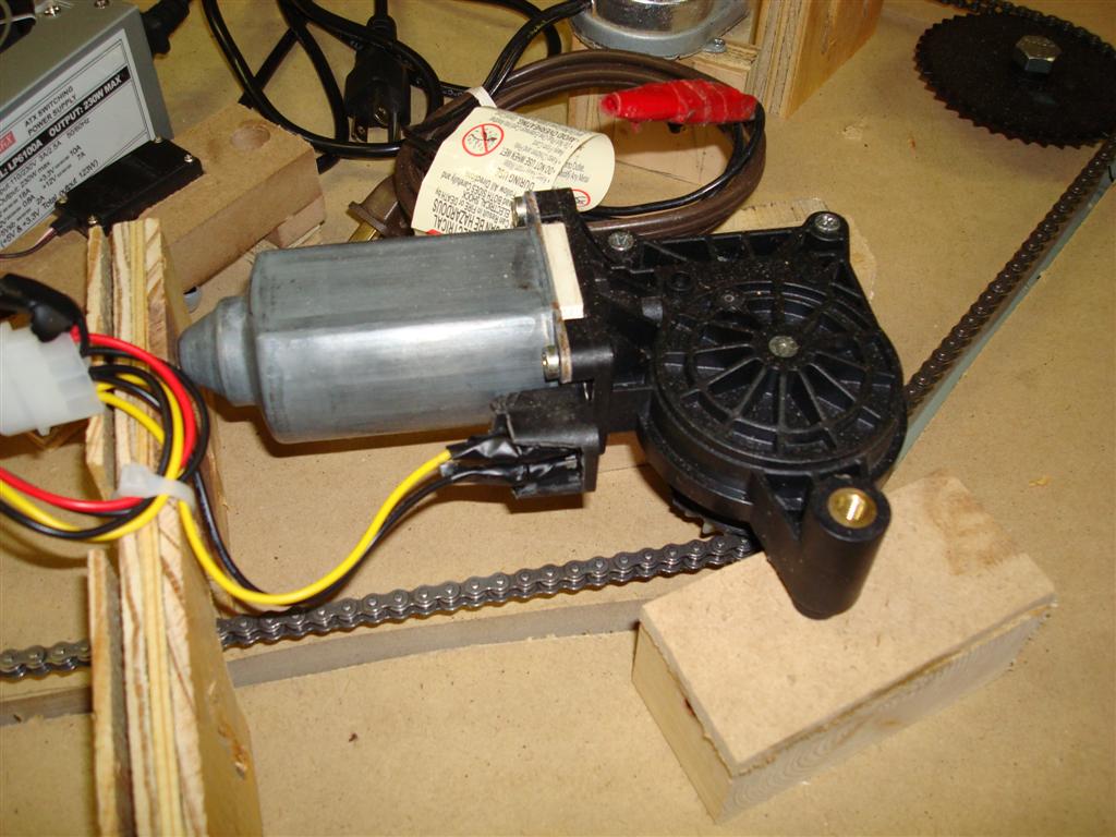 My favorite idea was making the Warthog drive around and not just move forward and back 2 inches. This was my first big test. Without this, I had to redesign. How lucky am I, just days after deciding on this concept a friend at work offered up his car window motor after the window mechanism broke. I would need a lot of torque to run the Warthog and this was it. I tested the motor after modifying it with a gear (and epoxy) on the counter. I found that I had ordered too little length of chain (only 6 ft) and that now limited how large the base could be in the center. Man, 6 feet sounded like plenty. After that test was successful I needed to build the base for a final test. Can it pull the Warthog? Can it turn the Warthog? It turns out it did great on the MDF. I still wasn't sure about adding sticky plastic under the plastic wheels but I assumed it would be fine.