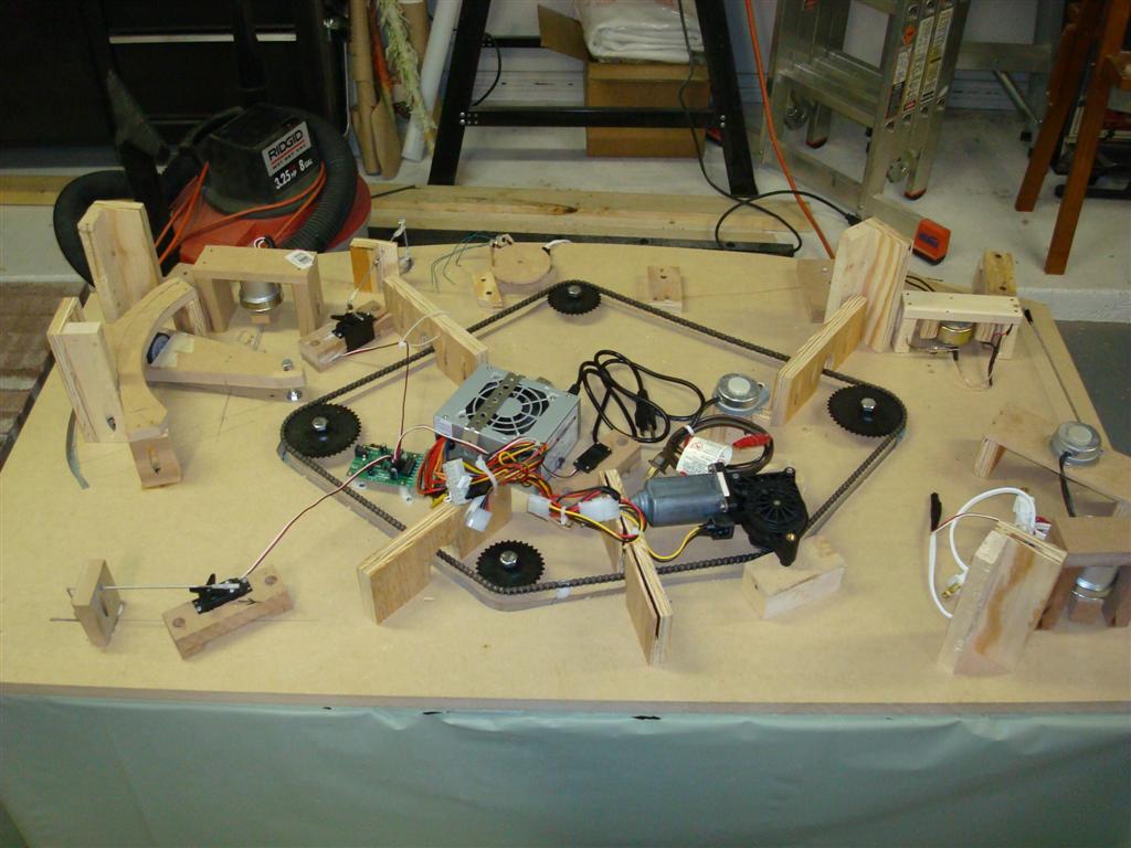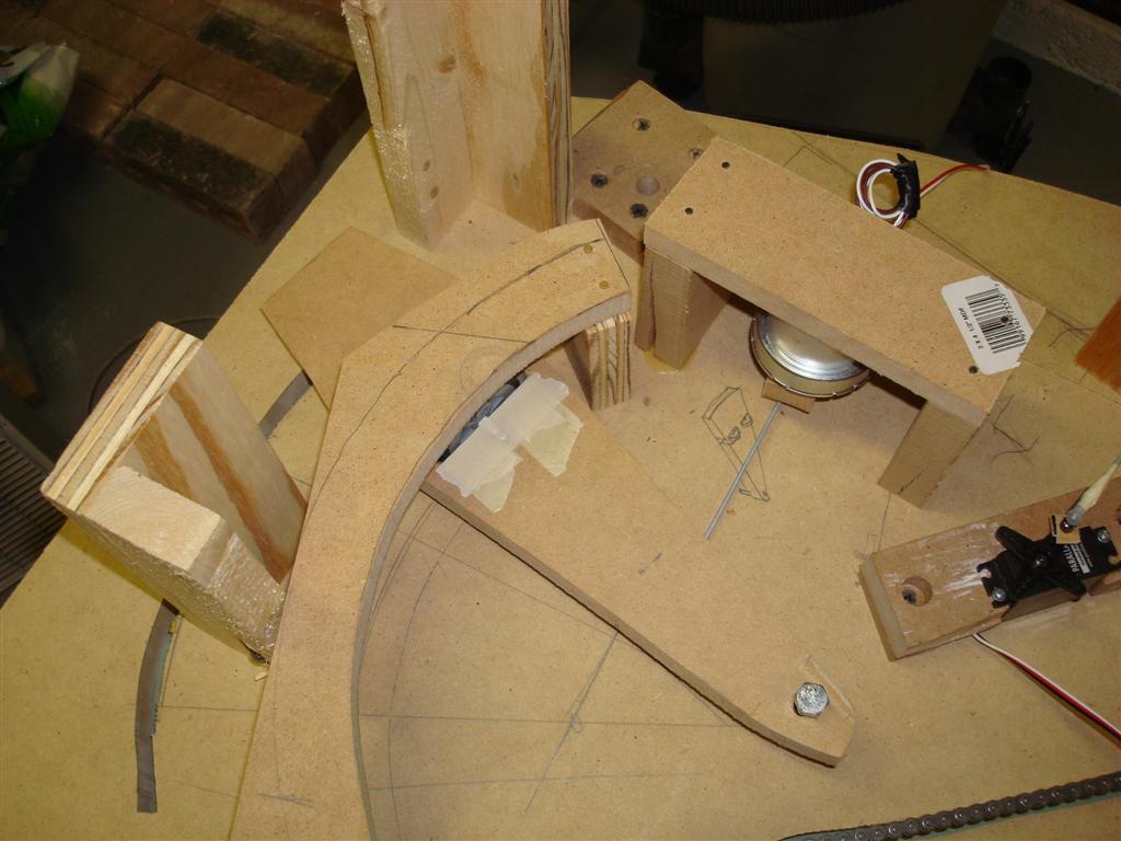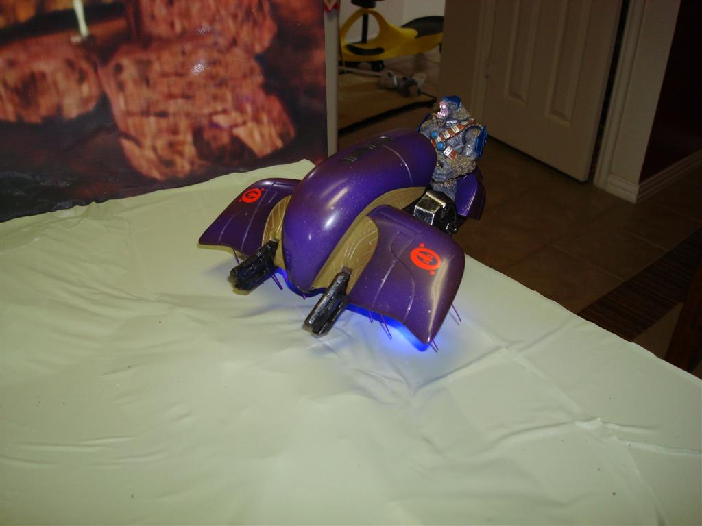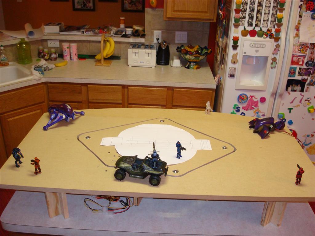 After that it was mostly standard motors and lights. I was quite proud of my Ghost movement however. It is a strange contraption with a oblong hole around a bolt and a wheel. When pulled and pushed it tipped the Ghost toward the direction of movement...just like the game, whoo hoo! Here are some shots of the underside of the cake. Banshee mech. Spartan armor and sniper mech as the motor turns, the nails press the leaf switches together closing a circuit to the EL wire. Active camo Spartan mech. Spartan in the rocks. Prop-1 controlling 3 servos before the lights were hooked up. Motor running the chain to move the Warthog. Most everything on there before final flip of the cake and wiring run down to the Prop-1 and other lighting.