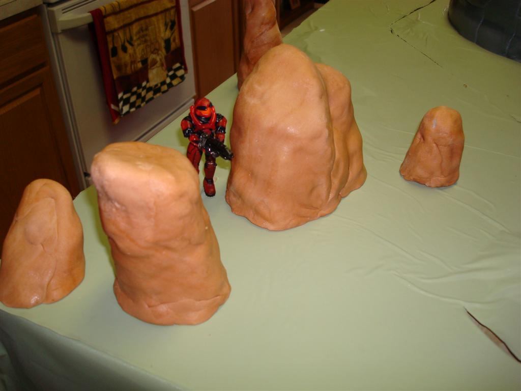 Next was random motion. I don't typically have random motion on the cakes due to the set rpm of the motors. I'd bought a Prop-1 controller board originally for the Halloween cake but ran out of time before testing. This time I really wanted to give it a go. I'd bought 6 servos as well, 3 180s and 3 continuous. I made a really nice foamcore test unit for everything which I'll be keeping for future cakes. After asking around the EFX-TEK forums for help, JonnyMac helped me out big time....uh by actually writing the code for me. I need some serious practice at writing code for sure. The Prop-1 board controls 3 of the Spartans. The Master Chief on the base, the red Spartan in the rocks, the active camo Spartan in the back and the ray of light from the base center. The servos run a random pattern each which I find really cool. Much neater than the standard back and forth motion I usually have. The base center lights up about every 15 seconds and stays on for about 10 seconds. I'm not exactly using the board to it's full potential but hey, it's a start and I think it added a LOT to the cake.