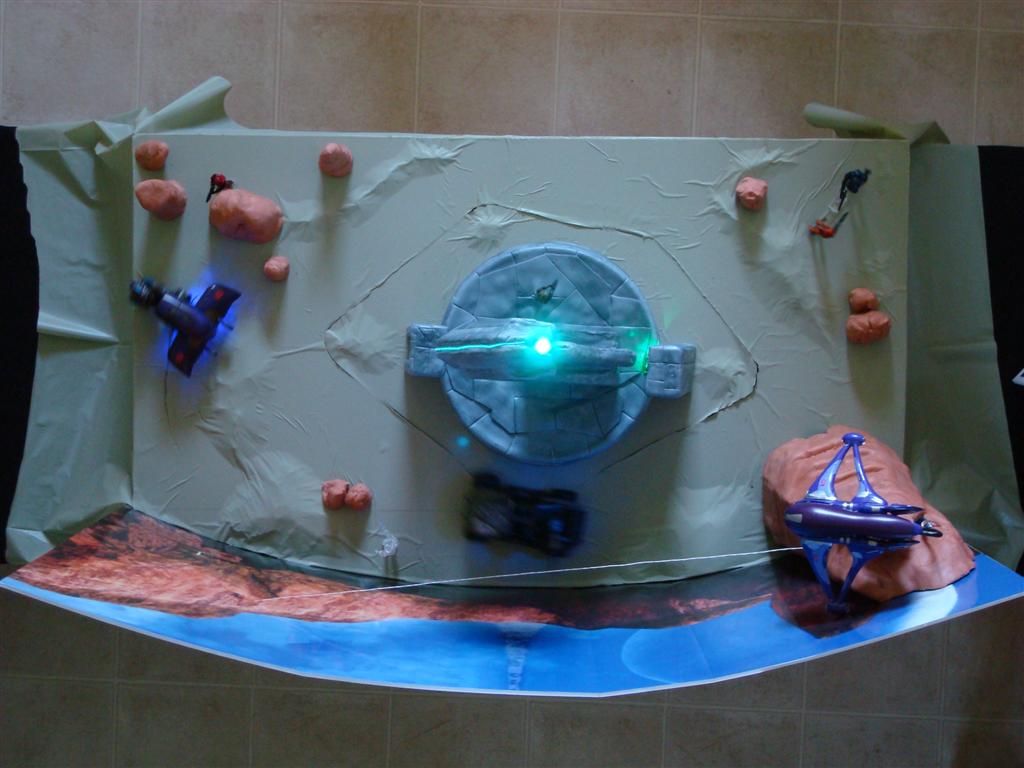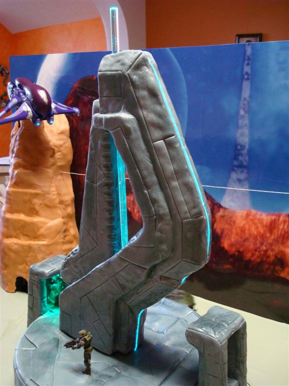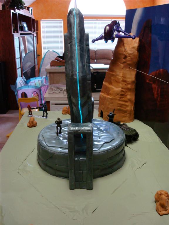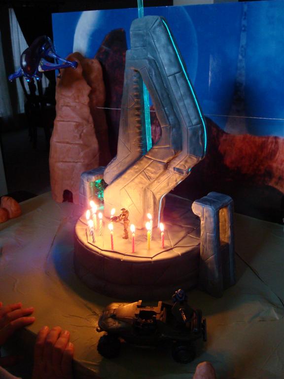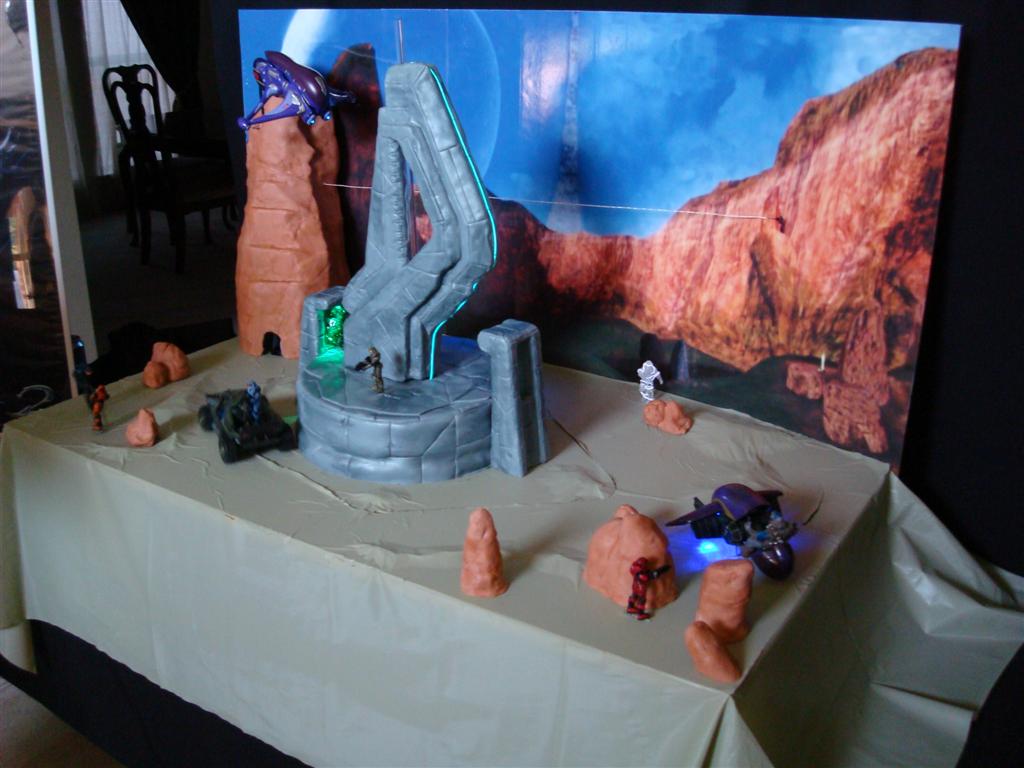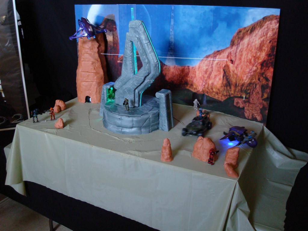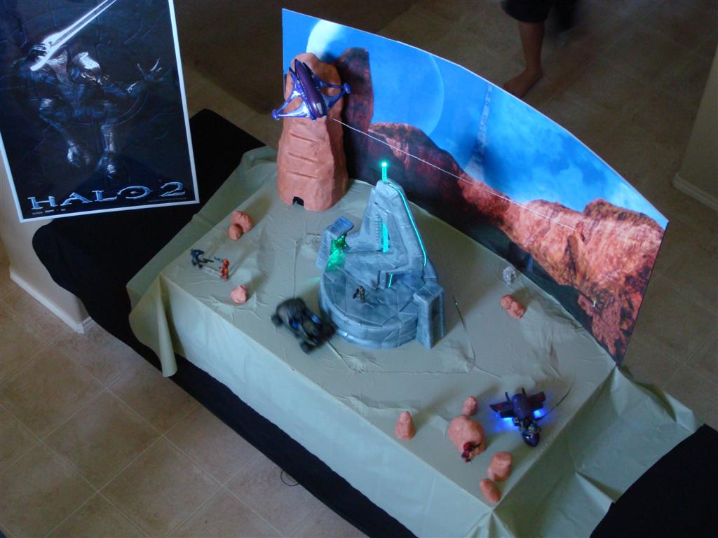 The Bad: Not everything works. The flashing LEDs I'd put in the Banshee to simulate it firing just stopped flashing the night before the party. The little circuit board controlling my fading blue LED for Cortana also popped. No idea what happened but I was able to weasel a plain old blue LED in there instead. The Cortana hovering over the control panel and fading in and out and flickering just didn't look right without the fading but ah well. The active camo Spartan did move and turn but once I added the EL wire my movement groove was too small for the shaft/solder joint/EL combo and the soldered joint popped off, bad planning there. Once it's together that far there is no going back to fix this stuff as it is always almost zero hour when it does happen. Also, the ground is just plain green. I meant to have a more hilly terrain and more color but I simply ran out of time. Note to self, don't work 60+ hour weeks at work and attempt to make a cake.