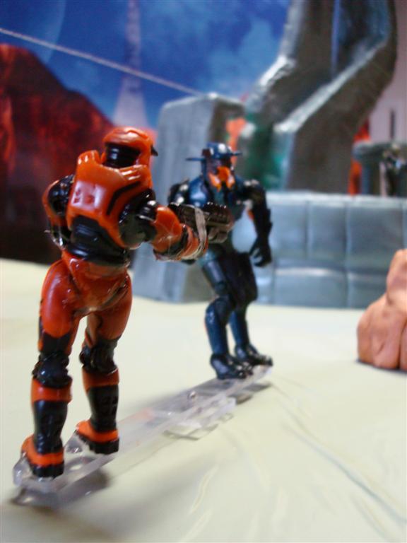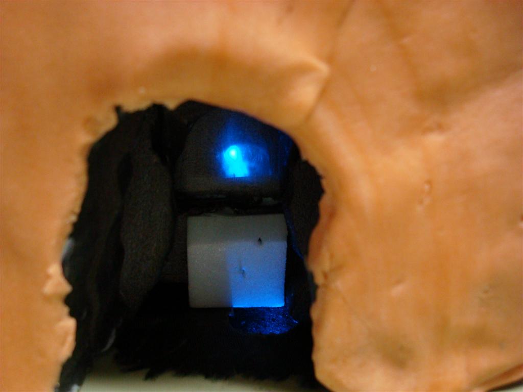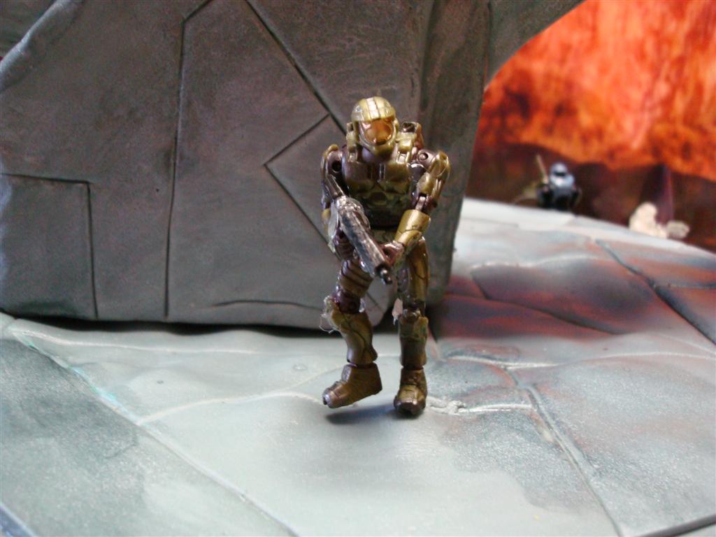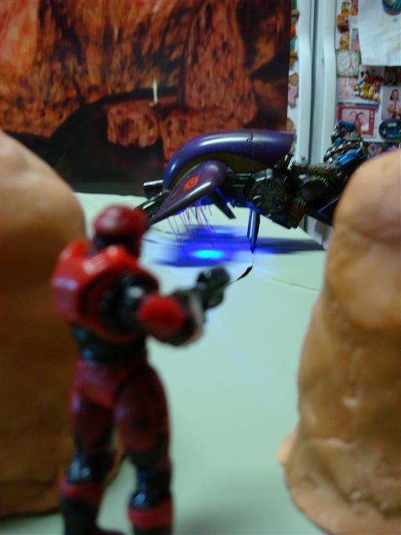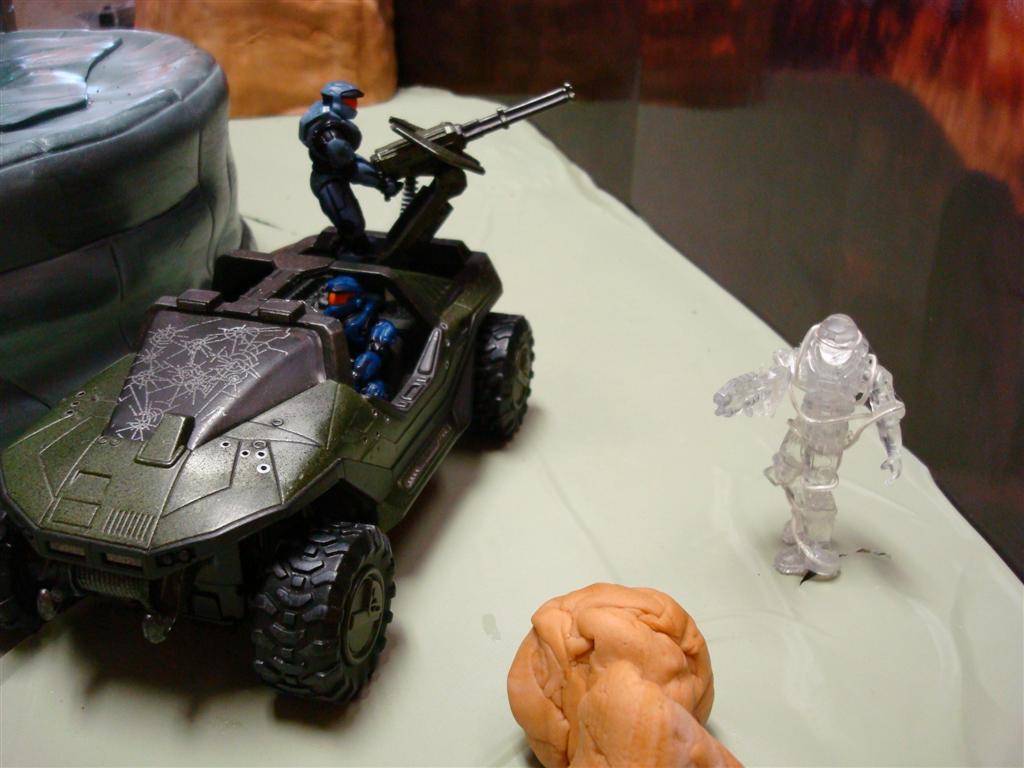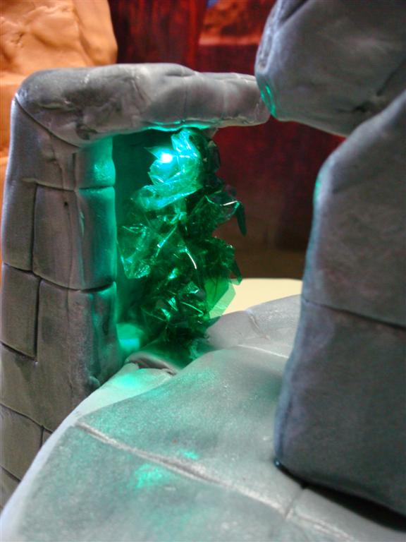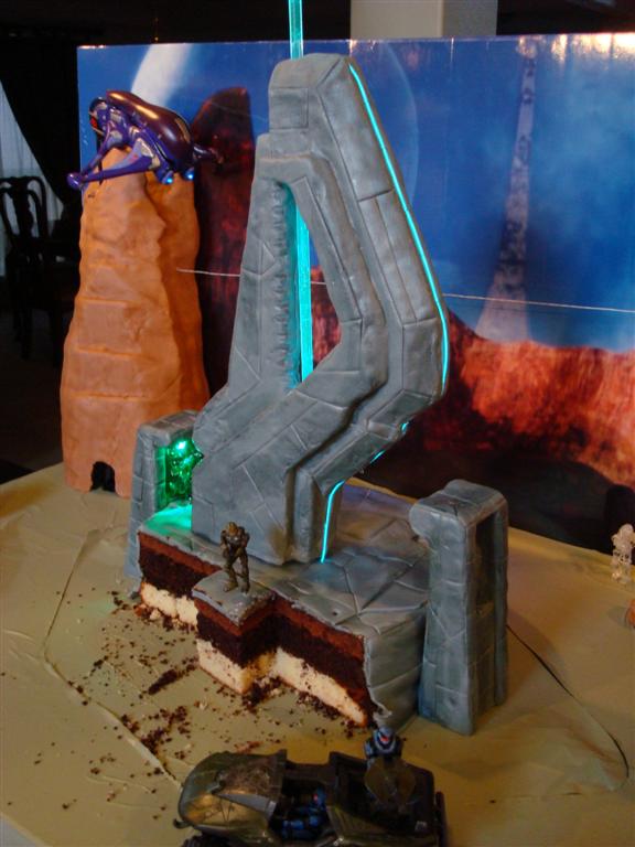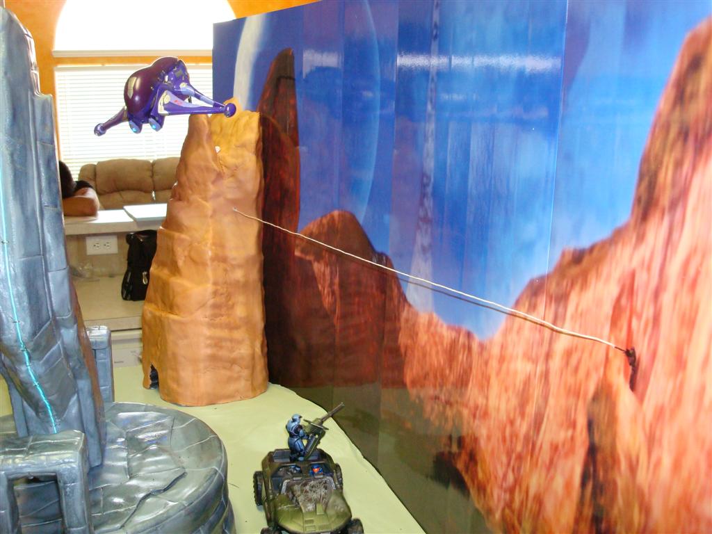 The Bad: Not everything works. The flashing LEDs I'd put in the Banshee to simulate it firing just stopped flashing the night before the party. The little circuit board controlling my fading blue LED for Cortana also popped. No idea what happened but I was able to weasel a plain old blue LED in there instead. The Cortana hovering over the control panel and fading in and out and flickering just didn't look right without the fading but ah well. The active camo Spartan did move and turn but once I added the EL wire my movement groove was too small for the shaft/solder joint/EL combo and the soldered joint popped off, bad planning there. Once it's together that far there is no going back to fix this stuff as it is always almost zero hour when it does happen. Also, the ground is just plain green. I meant to have a more hilly terrain and more color but I simply ran out of time. Note to self, don't work 60+ hour weeks at work and attempt to make a cake.