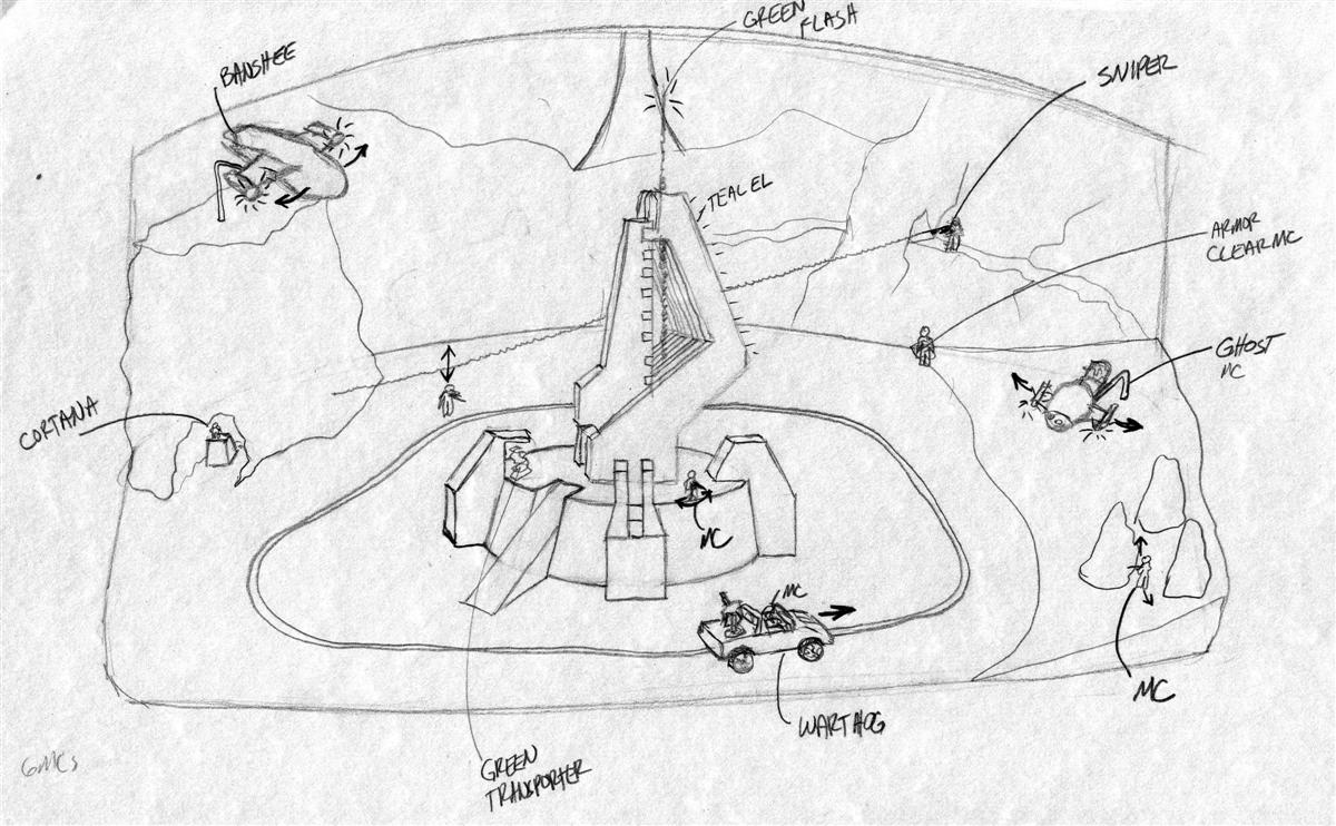Oh yeah, a Halo cake. Being a big fan of Halo, I was more than pleased to volunteer for a Halo cake. Until I volunteered anyway. With so many possibilities and being a fan it definitely made it more difficult to choose what to make. At first I was strictly going to make a level from the game. Then a multiplayer level. I was bent on Zanzibar because I really wanted the large wheel rotating on a cake. But after sketching and playing around with ideas I couldn't decide what would be cake, I didn't want the "ground" as cake again. There there is scale. What scale do I want? The large toys with will limit me to a very small scene or the small toys where I can show more? With Halo 3 coming out I decided I wanted to try to mix all three games and try to mix a little of each into the cake. I decided on my own montage level. I have a base loosely based off of the Halo 3 beta level Valhalla (not sure what'll change on final release), background from Coagulation, toys from Halo 2. I suppose there isn't much at all from Halo 1 except for the music I mixed for the cake. I started off with this sketch as my basic design. I laid out the toys I had to see how large everything would need to be for movement, scale etc.