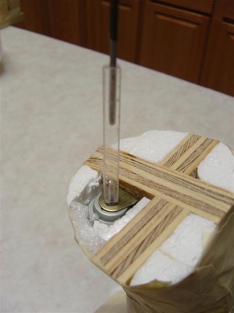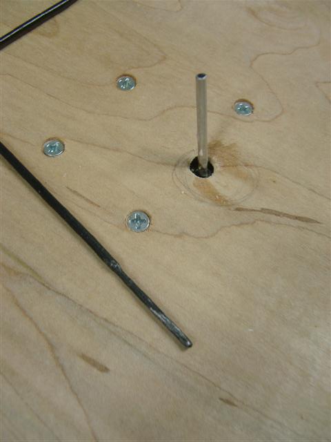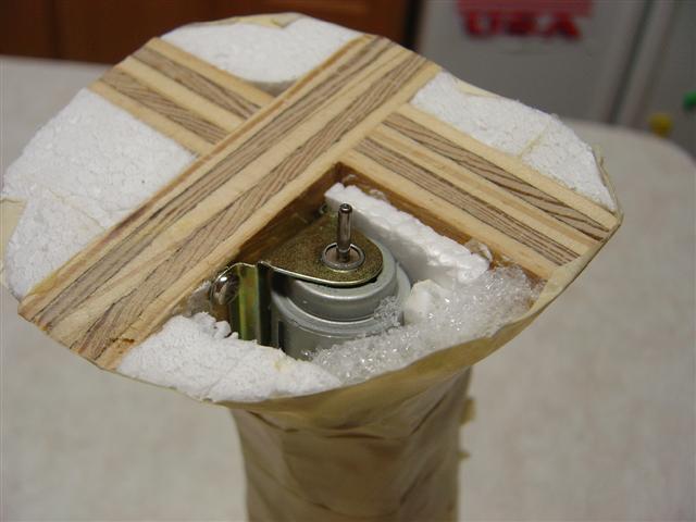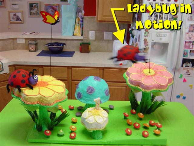 To make the ladybug fly. Lili made some really nice styrofoam ladybugs. We found a hobby motor for $2.50 at a local hobby shop. After experimenting for a bit with a bent clothes hanger, we found what arm length would work to make the bug go a nice easy speed. Having done that I made a second official wire hanger nice and straight and spray painted it black. To connect the hanger to the motor, I again hit the hobby shop for some small aluminum tubing. I epoxied the aluminum tubing to the motor shaft then ground the wire hanger to match the inside diameter of the tube so that it could be slid inside once the cake decorating was complete. (I originally tried this with some lexan but it wasn't very stable) Once the hobby motor was installed I ran the wire down the stem and out the bottom. I routed a groove for the wire to lay from the stem to where the battery would be hidden. It worked out real nice.