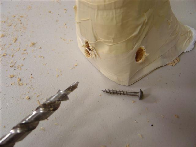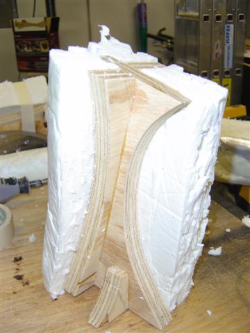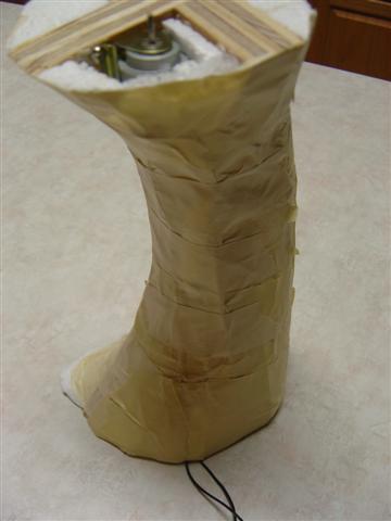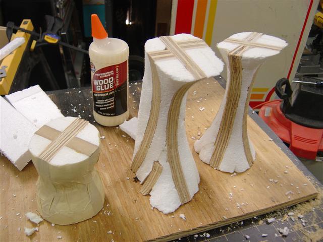 I constructed the stems out of plywood and styrofoam. I really wanted the stems to NOT come straight up. So I made it a point to have them curve and angle to to add a little organic effect. I just cut the 3/4" plywood into some curvy shapes and glued/tacked them together. To add a roundness I first started with some strange packing foam from computer monitor packing but it just flaked apart when cut so I had to abandon that stuff and go with some real classic styrofoam packing. I used the Dremel tool to shave away until it rounded out to match up with the wood. Then I ran over it with some 60 grit sandpaper to finish it off. I then wrapped the stems with masking tape just to make sure the foam did get bonged up somehow.