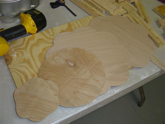I traced the cake molds to cut the platforms of the flowers and mushroom. I added some very short dowel pins the the small stem of Sydney's cake and corresponding holes in it's platform. I made sure they were nice and tight so that the cake didn't plop off on its own once the cake weight was on there.