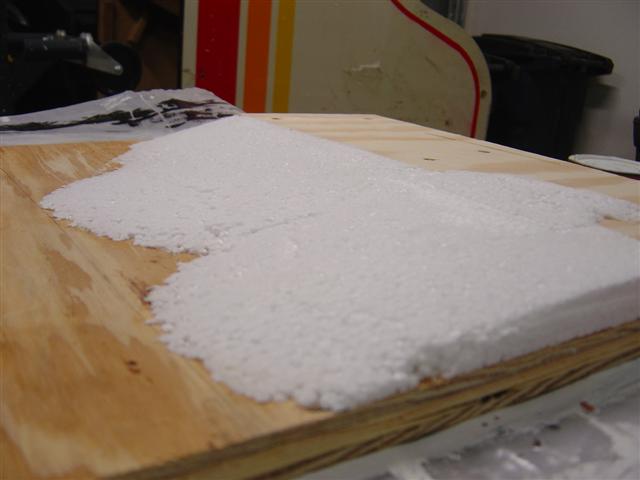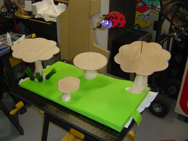 Next came the platform for the flowers to set on. It was going to be a flat 3/4" plywood but it sounded neater to make a small hill. So I attached another piece of ply and added some styrofoam to that as well to create a small hill. Too bad it is difficult to notice once the entire cake is assembled.