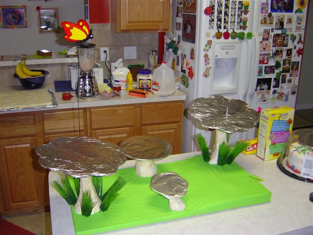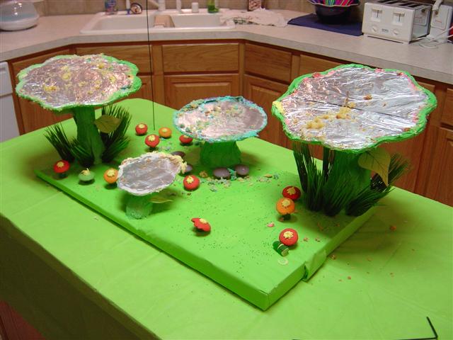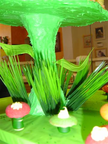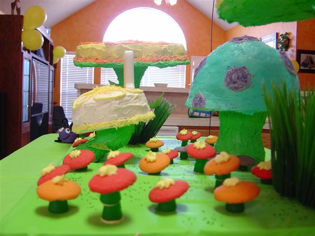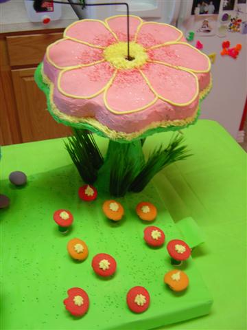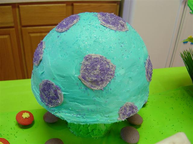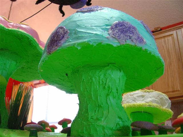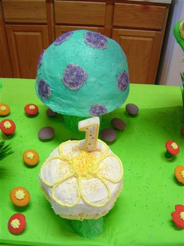 The mushroom was made of two cakes stacked up then cut to a nice round shape. The larger flower are from a very common cake mold you can find just about anywhere. The small flower was a round cake that we hand cut to match the base. We frosted all the way up the stems so that the entire flower would have the effect that it was completely made of cake. The baby flowers and baby mushrooms are colored vanilla cookies setting on top of green Dots (the candy). Another nice effect for almost no work :).
