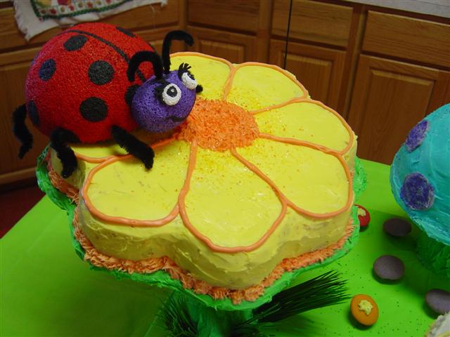 The cake idea really just came from the theme. Ladybugs. Well we first thought about just making one large half sphere ladybug cake but that seemed much too easy and a little boring for our daughters one and only first birthday party. So we came up with adding flower and a mushroom to the idea. Hey, ladybugs like flowers and mushrooms I suppose? As seen on Gaby's cake (below) we had already done a flat cake. I really don't see the fun of making another flat flower cake with a styrofoam bug on it. Although I really loved Gaby's cake, we just aren't doing the same thing twice! In order to make it more 3D the only thing we could think of was to try to make them look like real flowers, which meant raising them off of the table. Not too hard to figure out what would do that, stems.
