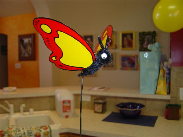 The butterfly was a last minute addition that just seemed right to add. Very simple really. Another wire hanger straightened and painted black. The butterfly itself is made of printed glossy photo paper glued together with a pipe cleaner body and some googly eyes glued on. A nice effect for very little work.