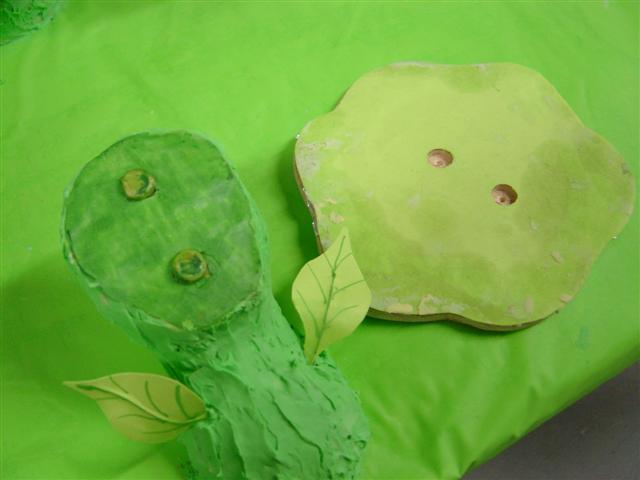I coved the main platform with 4 layers of green table cloth we got a the party store. I used 4 because it was so thin and transparent. I even had to paint the base white to add in color coverage otherwise it would have taken 8 layers!
