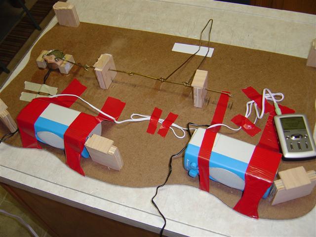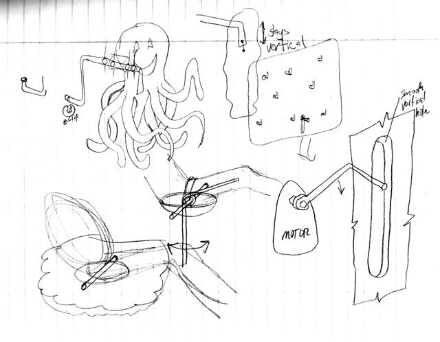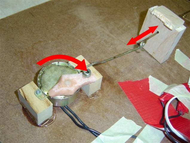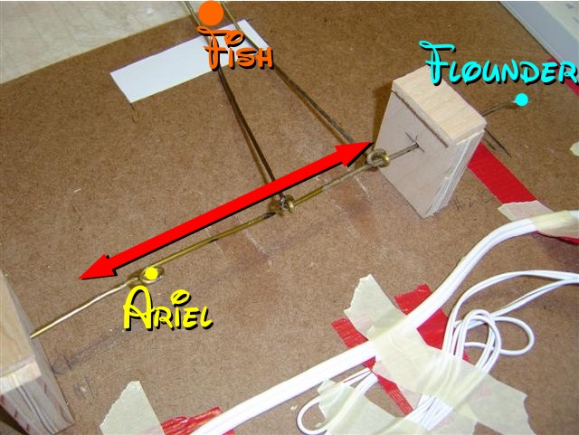 Next, the movement. This was another debauchery of mine. I thought I ordered 2 motors at 30 rpm and 1 at 3 rpm, well it was the other way around. I noticed this just as I was pulling parts after creating most of the mechanics inside. After freaking out and trying to decide if I could get a second motor in a day I got an idea to run Ariel, Flounder and all other fish off of the single 30 rpm motor. Here is the motor driving the characters, and here is the rod that is moving them. The swimming fish ran easily off of the shaft of the 3 rpm motor mounted just under the cake. I also had some cheapie speakers laying around that fit under the cake and I used my Dell DJ to play the original movie music. Here you can see everything put together underneath (minus the surge strip). The fish dance by all attaching to a bent wire that is attached to a single moving structure. The wire is bent so that as the bend in the back of the tank moves the portion of the wire running through the tank acts as a pivot and rotates the fish attached in the front. In this sketch I was planning it out using a separate motor but it really does work about the same.