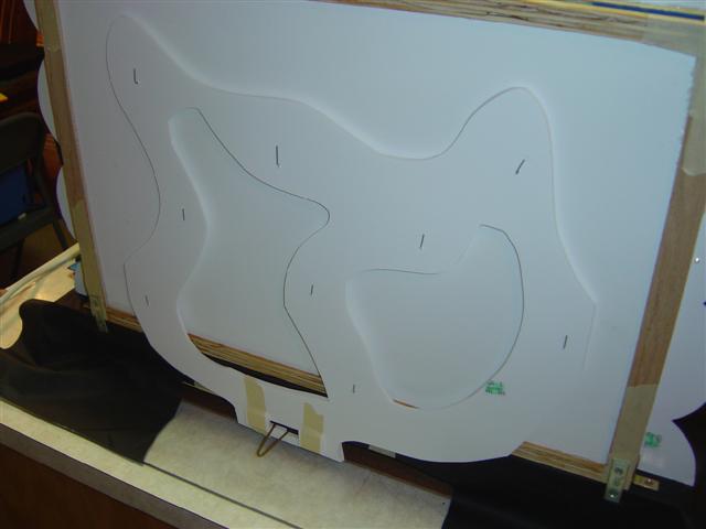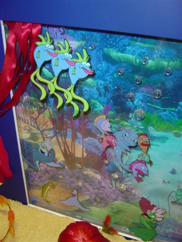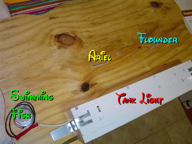 OK, first the bad. I initially went out a bought what I thought we would need and of course got the wrong stuff. We wanted there to be real water with real bubbles rising in the background but I got a really thin polycarbonate rather than a 1/4" thickness. And since I wanted fish dancing in front we had to place dowels in the tank to allow the wiring to come through I got the dowels and drilled holes through them to allow for wire to come though the tank. I first tried to place the dowels inside the tank and allow the surface area of the dowel to glue to the poly and hold the load of the water. Well, I got 5/16 dowels and they didn't have enough glue area to hold so it leaked (even with copious amounts of Silicone II). So then I tried putting full 5/16" holes in the poly and gluing around the dowel. This also allowed silicone on both sides of the dowel for more strength. Well the poly was too thin and didn't have enough surface area to hold the dowels and it leaked. I think the main reason is, even though the tank was only 1/4" deep inside, the poly still bowed when if filled with 18" of water above it. Yep, 1/4" would have done it. I also couldn't get any larger poly dowel because I had to order it and this was Tuesday before the Saturday party. Yikes! So we had to abandon the water and move on.... I had a friend print the background graphic so I laminated and attached that to the tank. It is a screenshot from Finding Nemo, shhhhhh.....