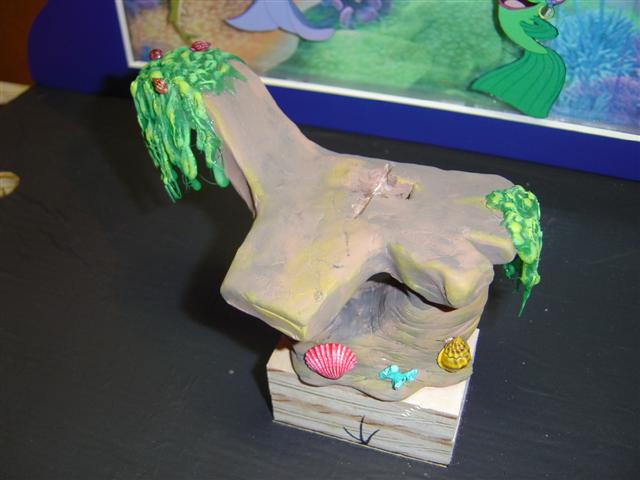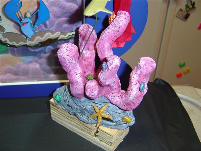 We were able to find, what I consider, the best Ariel I've ever seen as a toy. She is almost like a Barbie but is the Disney Princess series. This was perfect. But we couldn't find a Flounder the same scale so we decided to make one. I made three flounders out of Super Sculpey clay. Then I Dremeled some slots for the fins and let Lili paint them. Then I printed the fins on transparency paper because I wanted them to be kind of see through and glued them in the slots. Next I wanted to add a bit of the movie to stay with the theme. If anyone remembers, Ariel lays on a rock formation plucking petals from a flower before the Under the Sea song starts. I wanted Ariel to sit on this formation on the cake. I also made this out of Sculpey clay as it is easy to do. I know realize the scale is completely off but if we followed the scale for this project it would have been 15" rock on a cake. Too big. After it was hardened Lili painted it, I added shells and created seaweed and anemone by dripping on hot glue until it looked about like the movie rock. Then I painted the weeds and anemone, although I changed the weed color to green as I didn't want to explain what it was supposed to be at the party. This is what the rock looked like. I also wanted a coral on the side. I found one at Walmart that was only about 2.5" tall for 5 bucks, it was a really sad looking thing for the cost, so I made one myself out of Sculpey again. This one I had to make a wire frame underneath so that it wouldn't bend over before hardening. I used a wire brush to crate a texture and then it was easy to paint. I also added a little fish above it. This is how the coral turned out.