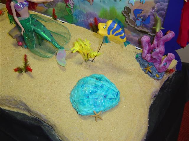 The cake was the easiest part. It was just a bunch of flat cakes placed on there and cut up and down to remove the flatness. We used white frosting with a small amount of chocolate to darken it. Then crushed graham crackers and spread them over the top to make sand. I added some wet glitter as well to make it look more sandylike. Syd's shell cake was put on a base made out of Sculpey, we used extra cake and cut to form then frosted. Lili added some coloring after it was spread and we ran the spatula over it until it blended in and gave the shell some texture and color.
