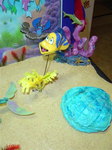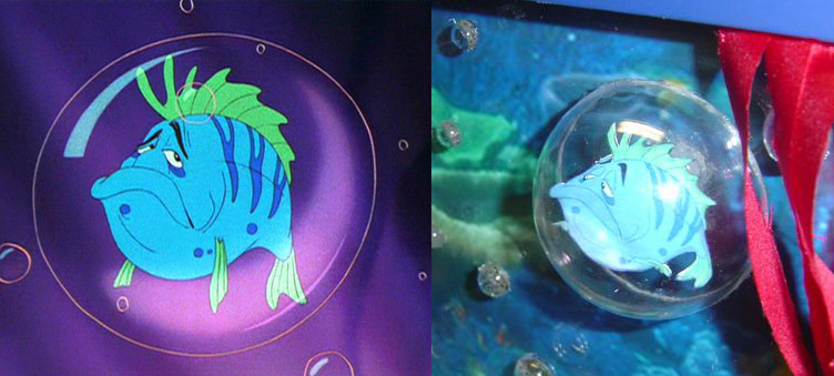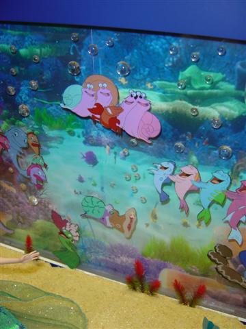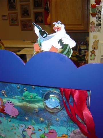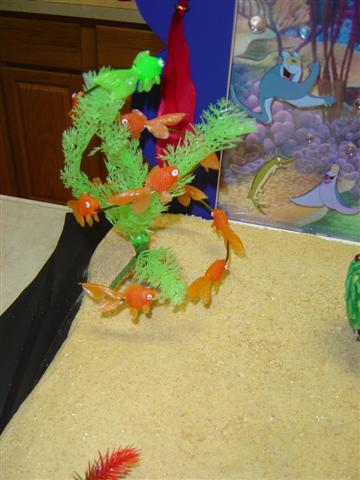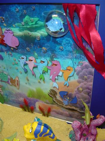 Once the base was completed and the tank installed we could go about adding fish. We printed the fish from screen shots of the movie and cut them out. Some I edited to place the fish overlapping so we could have more fish in the dance :). I added them to the tank by taping them to wire I'd placed through the dowels. Here, here and here. My favorite part of the cake is the fish in the bubble dancing. I got a bunch of orange fish from Chuck E Cheese and used them to make the swimming school of fish from a clothes hanger. I attached this to the motor with a chunk created from Sculpey. We added Scuttle at the last minute just to put something up top. I added a few various sized glass hemispheres the the tank to create the illusion of bubbles. We finished up by adding a border to the tank, a back to the tank to conceal the mechs, and a red silk "seaweed" curtain.
