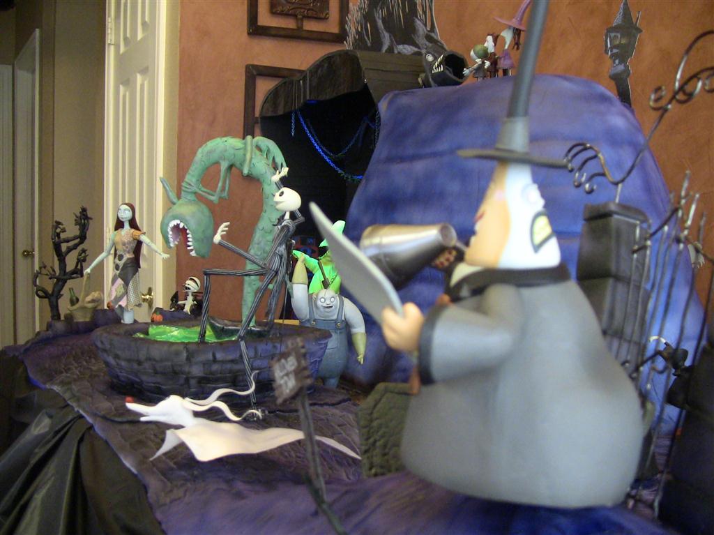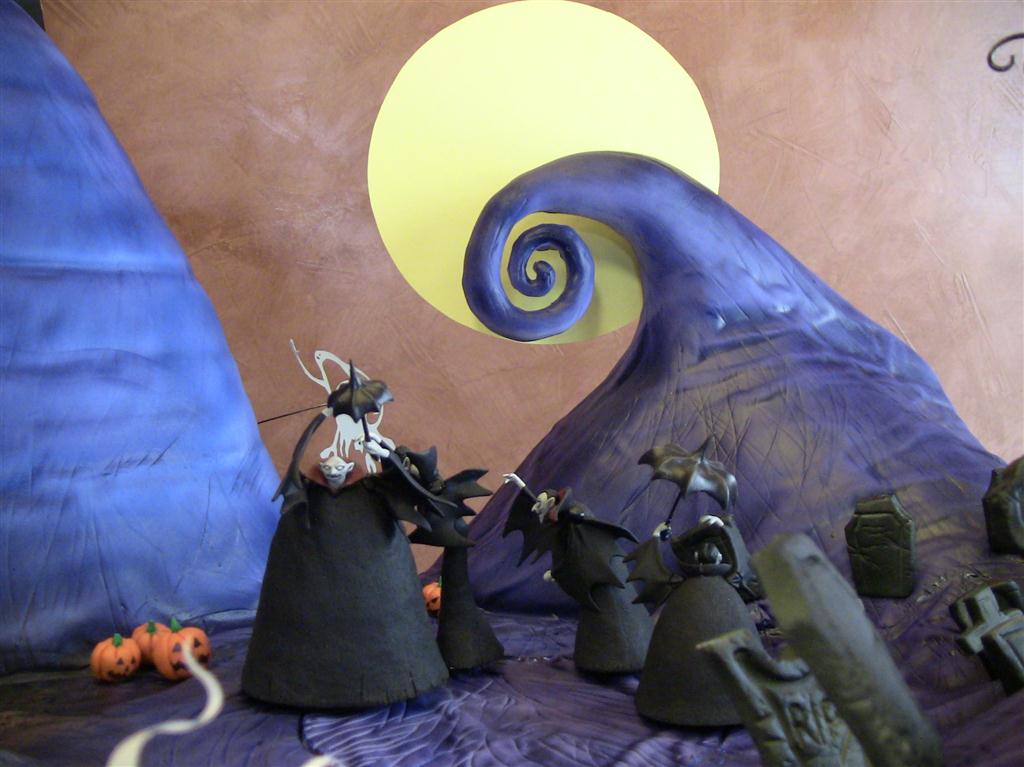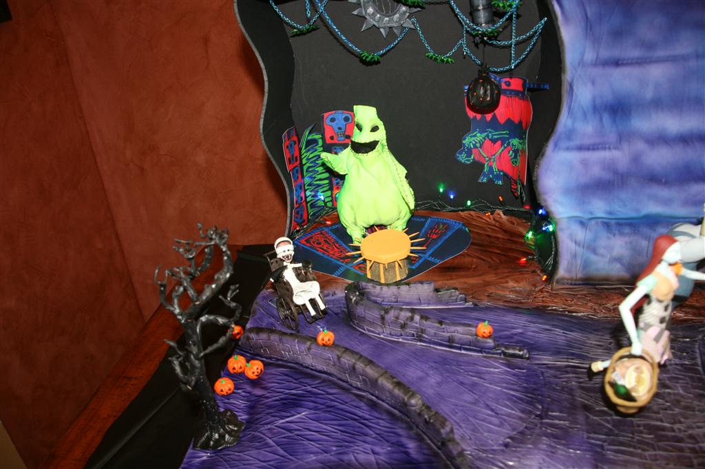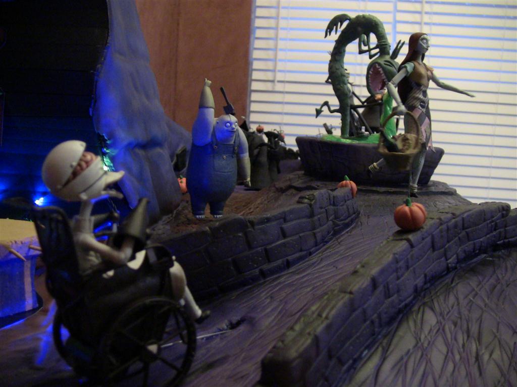 We got Lock, Shock and Barrel up on top of the hill lowering Santa (in the Halloween sack) into Oogie's lair. Dr Finklestein is attempting to go up to get Sally but can't. Sally is dancing away dreaming of Jack. Jack is as usual singing. The mayor is barking out orders over in the corner. Zero the ghost dog is hanging out by Jack. The vampires are wandering around next to the cemetary. The monster is dancing away behind Sally. And ghosts are flying behind the hill.