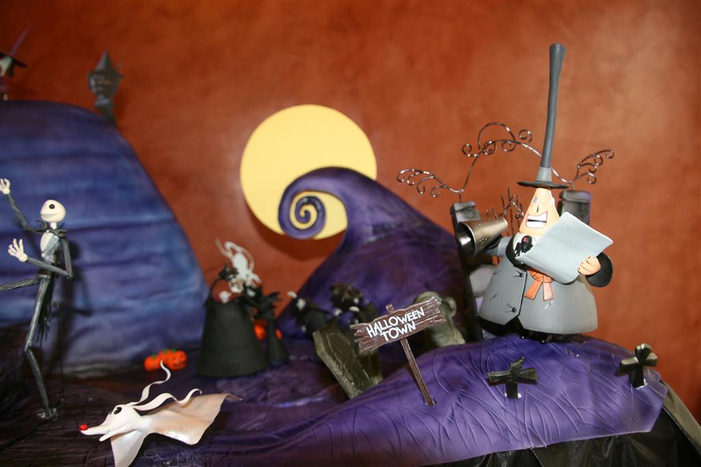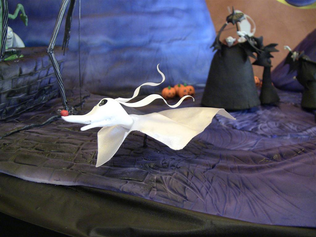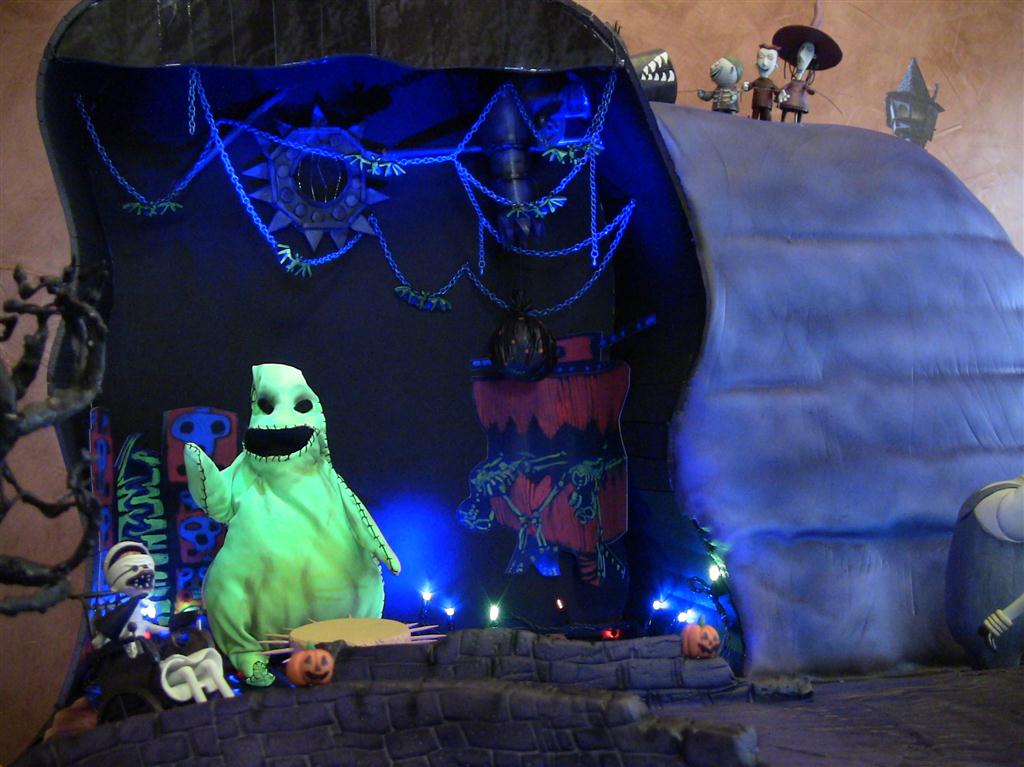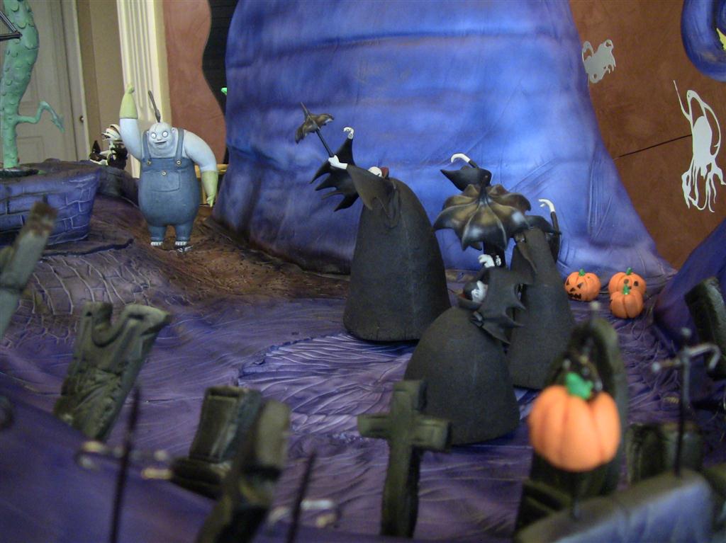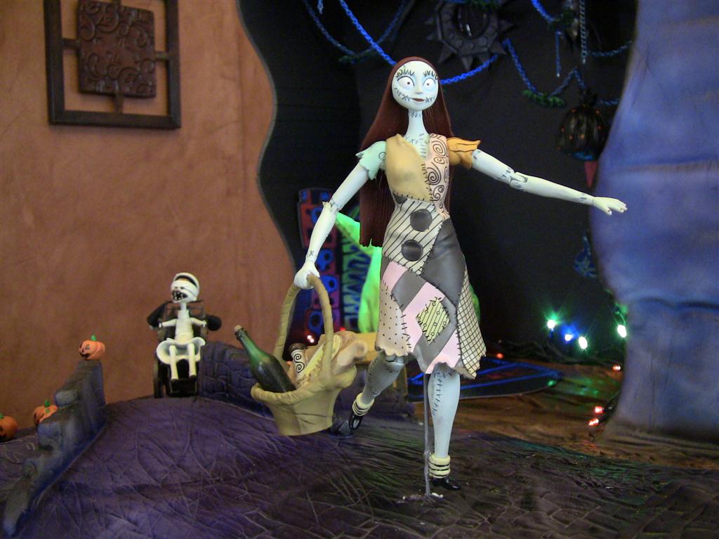 We got Lock, Shock and Barrel up on top of the hill lowering Santa (in the Halloween sack) into Oogie's lair. Dr Finklestein is attempting to go up to get Sally but can't. Sally is dancing away dreaming of Jack. Jack is as usual singing. The mayor is barking out orders over in the corner. Zero the ghost dog is hanging out by Jack. The vampires are wandering around next to the cemetary. The monster is dancing away behind Sally. And ghosts are flying behind the hill.