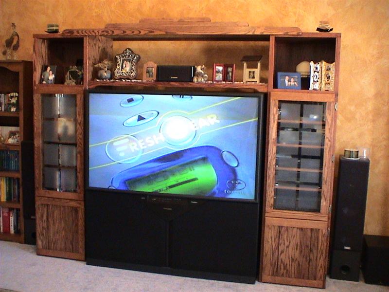 mmmmmm.......TV........ I talked about getting the 65" TV for years and years but when I finally got one my entertainment center was far too small to accommodate it and of course we were now poor having paid for the TV so we decided to build an EC to fit our needs. And most entertainment centers have just two cabinets at the bottom which are only useful for piling junk into. I wanted one that would hold game systems :). I got the tv a month before the Xbox and Halo came out, whoohoo!!!! Best purchase I ever made.