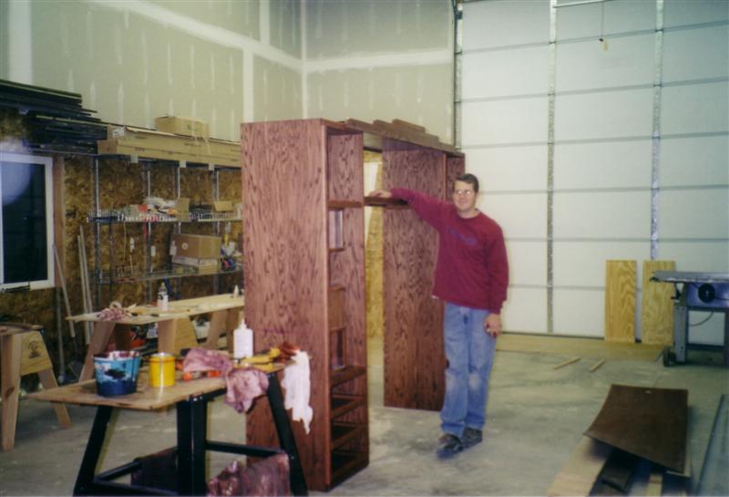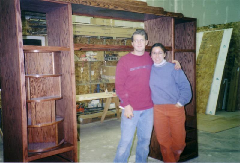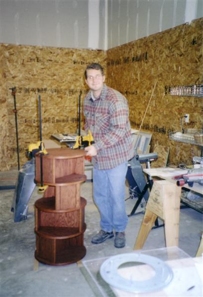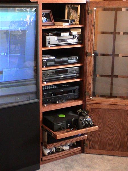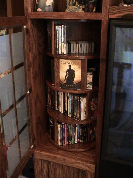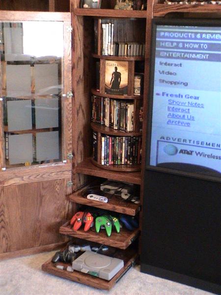 I spent a few weeks thinking about what I really wanted and came up with a four piece design that is relatively simple. Left and right cabinets with two shelves in between. The top shelf is shaped similar to the old movie theater marquees since we generally watch more movies than regular old stations. The left side would hold DVD movies, but not like a typical cab that you either stack everything on top of each other or pull out plastic shelves that you have to flick through to find a movie, I made it a lazy suzan so that it would hold just around 200 DVDs/games and still be relatively easy to search through. The right side would hold the components ie DVD player, VCR, receiver, CD player, etc. The top of each side and center shelf is more or less reserved for foo foo (womany decoration items).