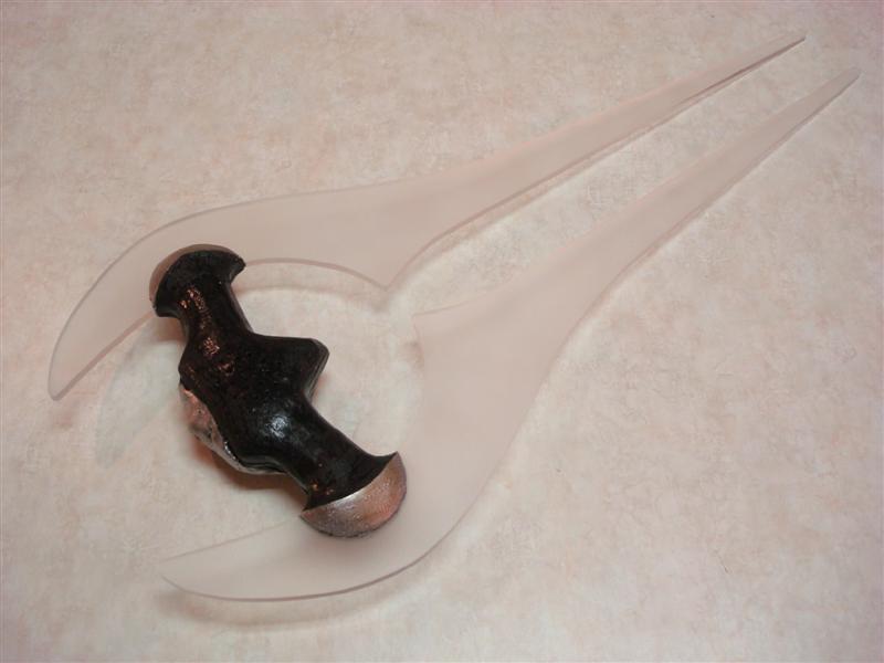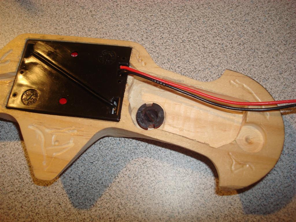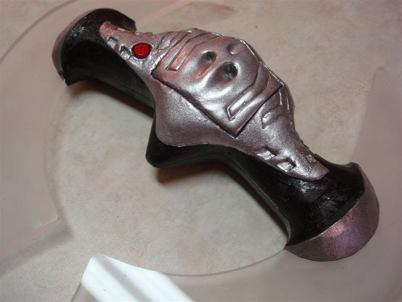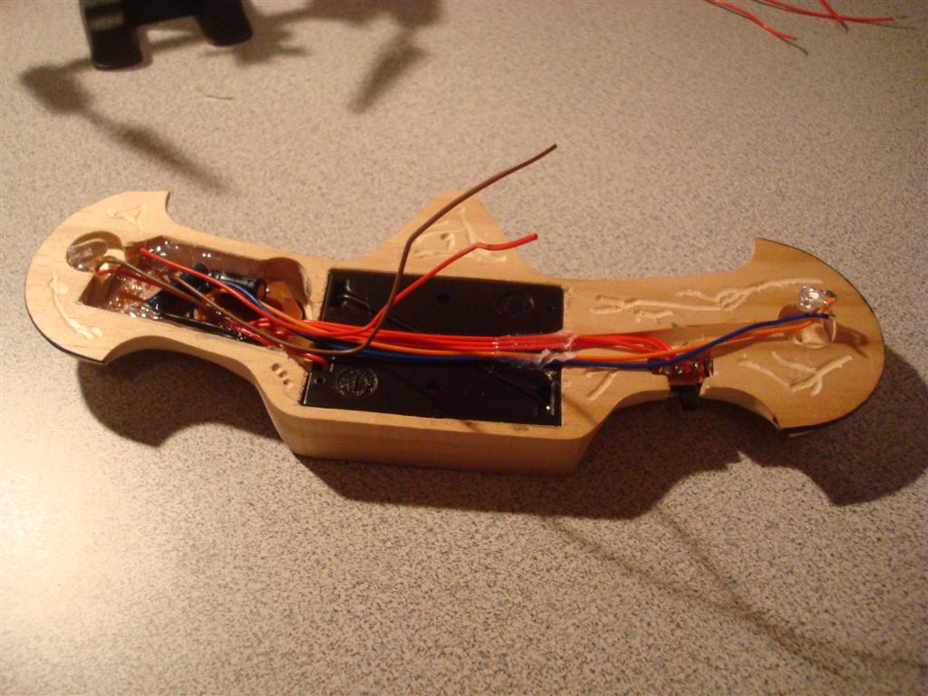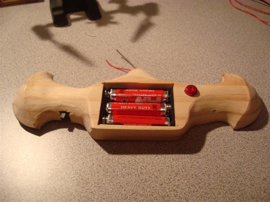 I used the same template to cut the handle shape so it would match with much less work. After that I shaped the handles as well as I could with the dremel and cut all of the pockets for the circuit board, speaker, button, on/off switch and LEDs. The sword handles do not match the game as I decided to place some of the handle over the blades to hide the LEDs. I placed all of the electronics and battery pack in the wooden handles. And epoxied it all together. I wish the sword had come with more LEDs, only facing one forward on each half doesn't quite seem sufficient. Next sword more lights :). After the wooden part was complete, I added a sintra battery cover. Then some more details using Apoxie clay. Not too happy with this step as I screwed up and ended up with a gimongous line around the battery compartment. Then the paint and it was all ready for shipping. Over all I was really really happy with it. Fun as hell to swing around.