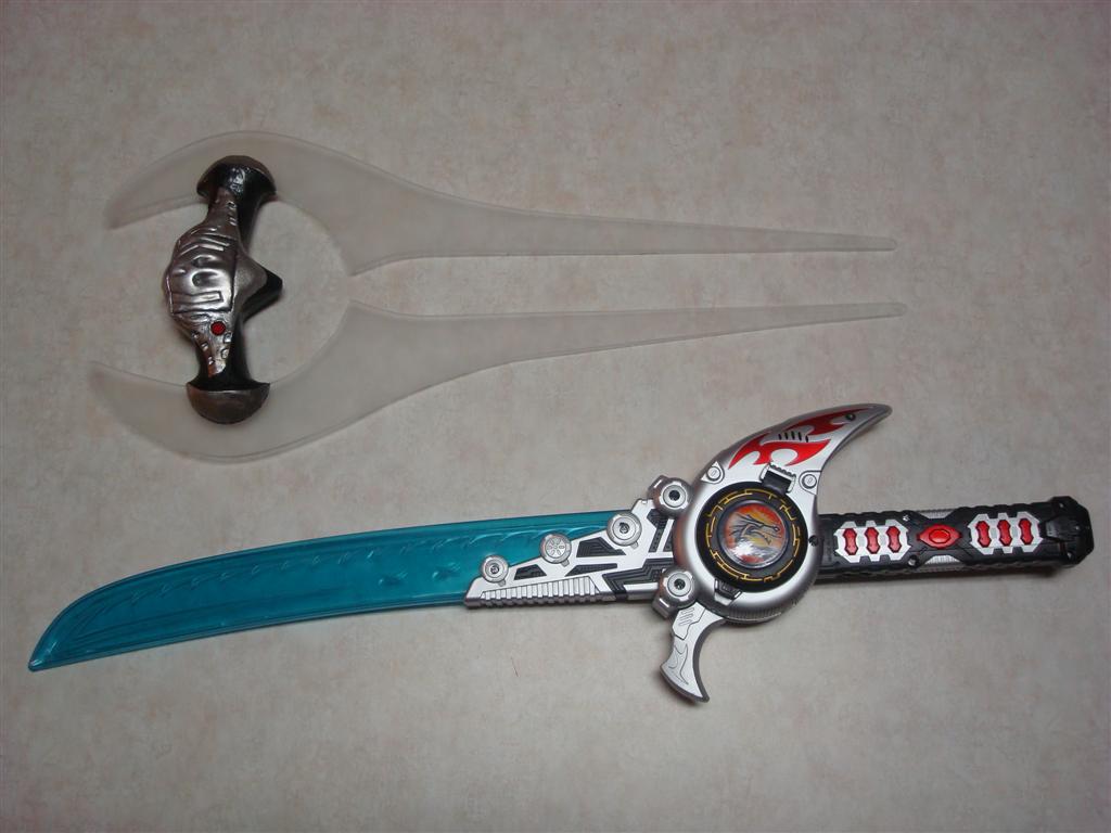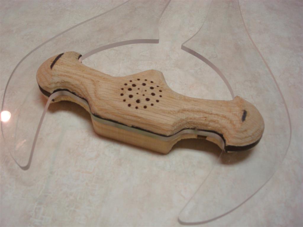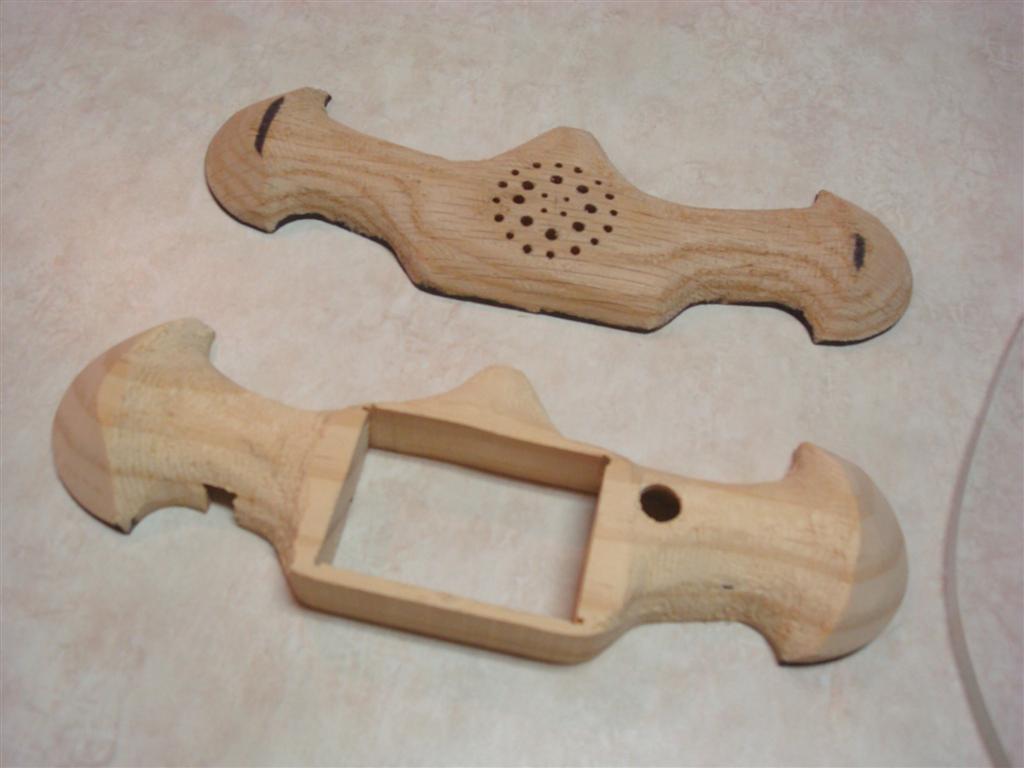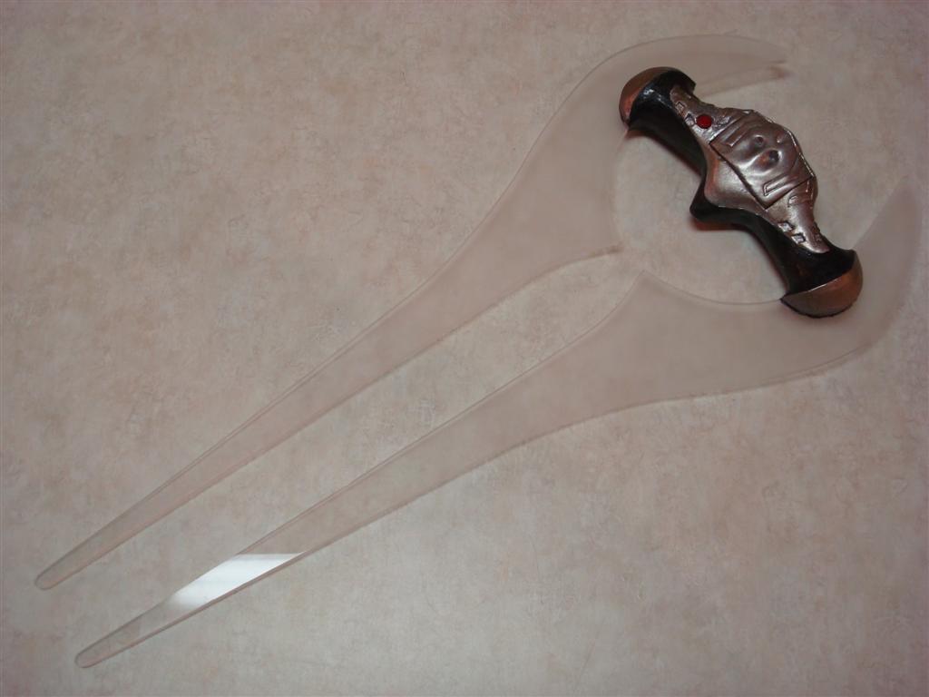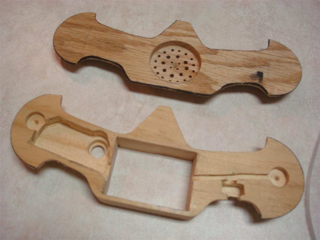 I used the same template to cut the handle shape so it would match with much less work. After that I shaped the handles as well as I could with the dremel and cut all of the pockets for the circuit board, speaker, button, on/off switch and LEDs. The sword handles do not match the game as I decided to place some of the handle over the blades to hide the LEDs. I placed all of the electronics and battery pack in the wooden handles. And epoxied it all together. I wish the sword had come with more LEDs, only facing one forward on each half doesn't quite seem sufficient. Next sword more lights :). After the wooden part was complete, I added a sintra battery cover. Then some more details using Apoxie clay. Not too happy with this step as I screwed up and ended up with a gimongous line around the battery compartment. Then the paint and it was all ready for shipping. Over all I was really really happy with it. Fun as hell to swing around.
